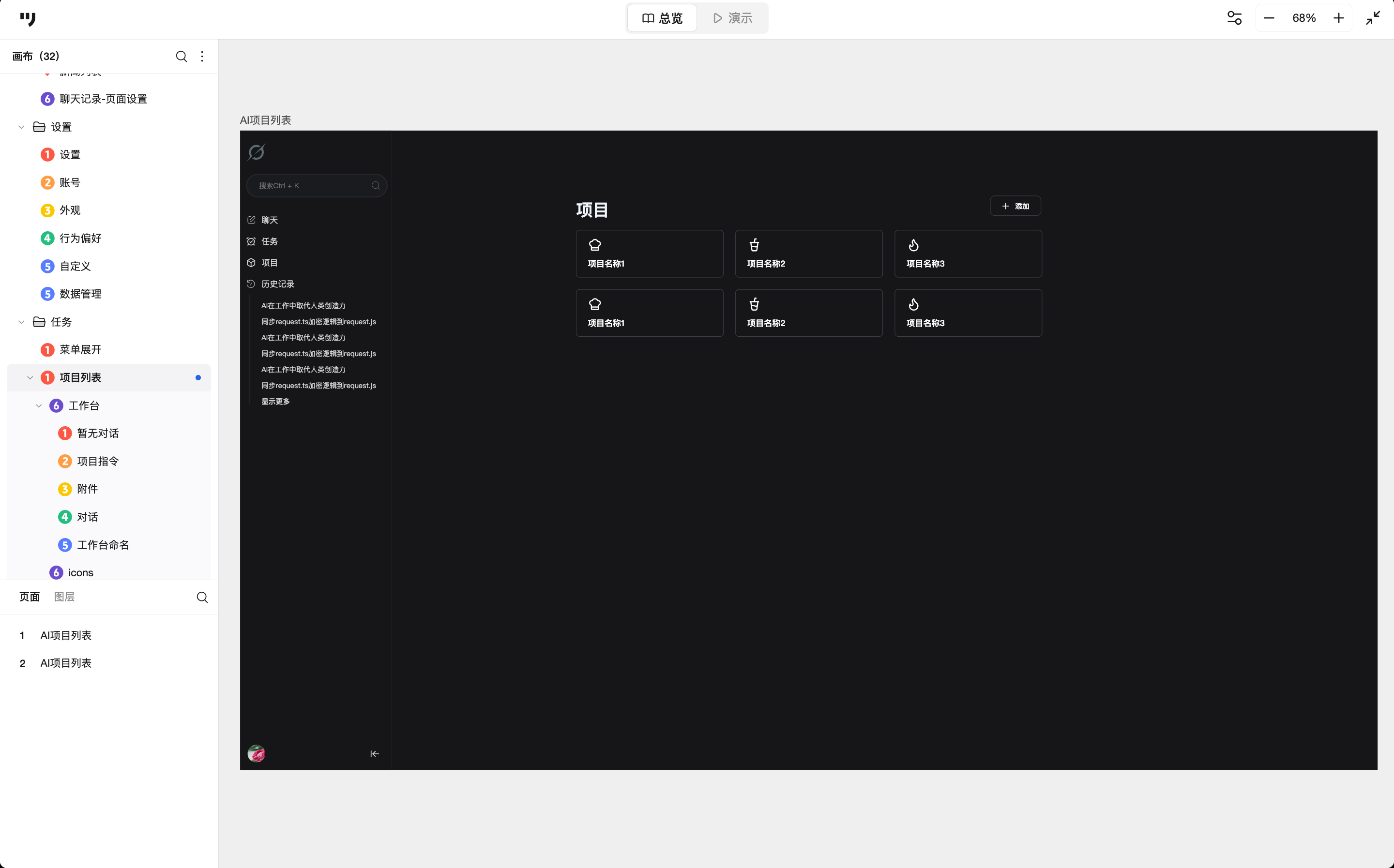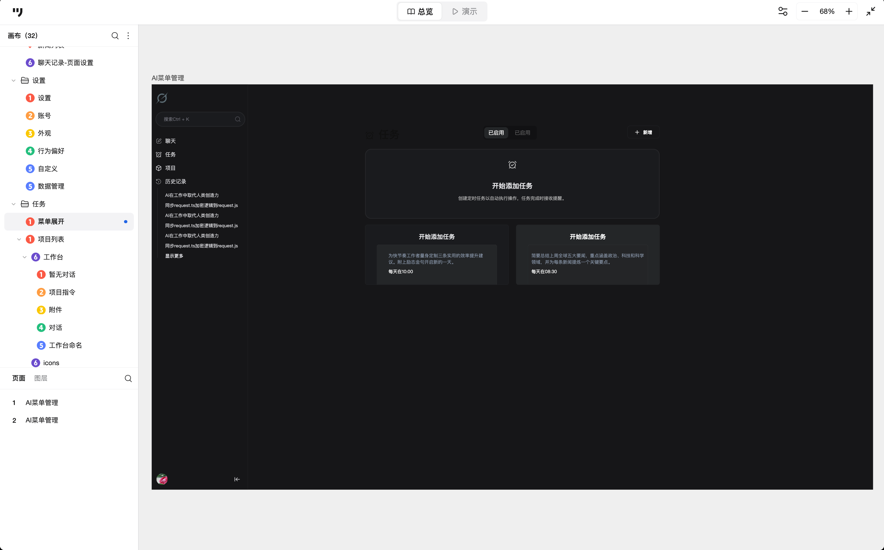 这次分享的是一套基于墨刀素材广场的AI智能对话Web高保真原型案例。这套原型有三个核心场景:AI对话、任务管理、工作台,整体设计风格走的是极简路线,有深色与浅色两种模式。这套原型已经覆盖了AI SaaS、开发者工具、AIAgent平台等常见的核心场景,完成度和参考价值很高。