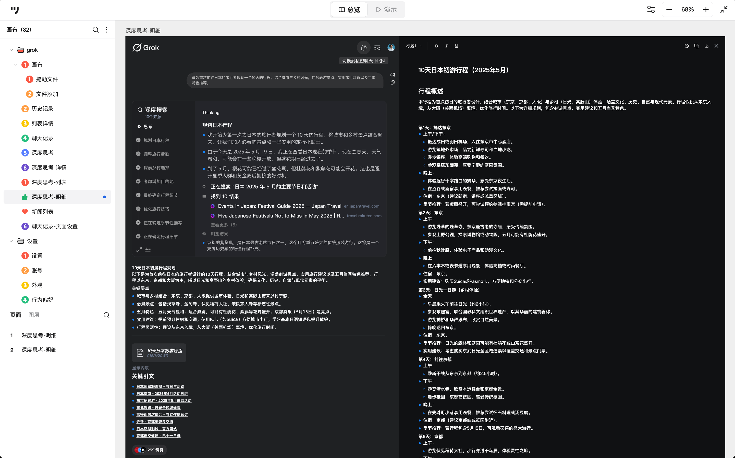 在输入框区域可以开启"深度思考模式",整体呈现方式与OpenAI的高级模式比较相似。在AI深度搜索或推理时: