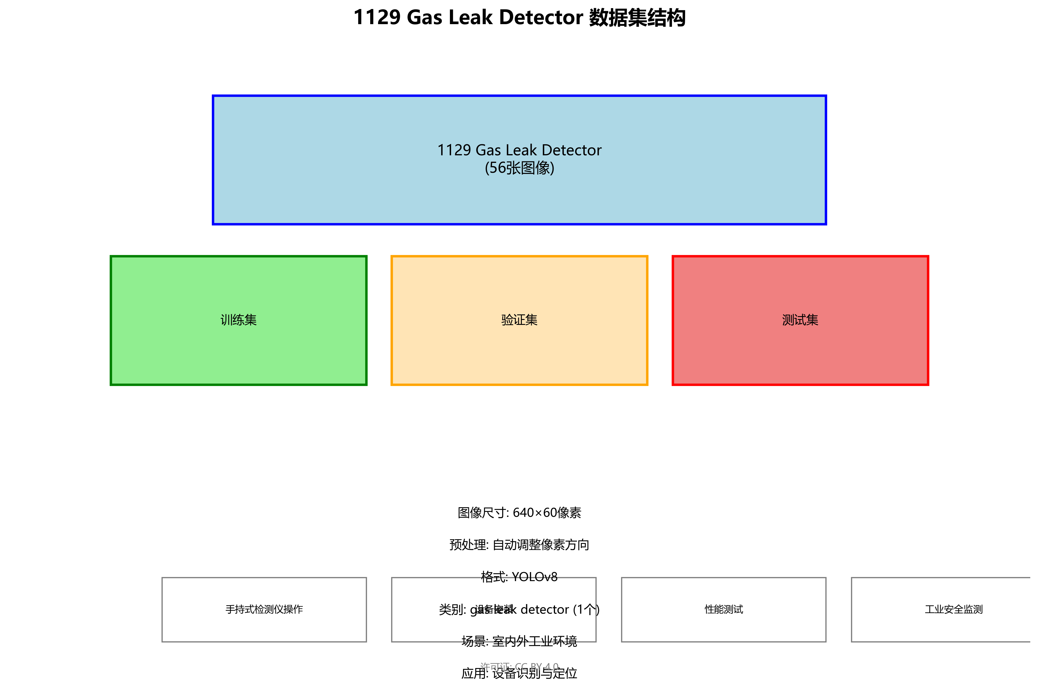 本数据集名为'1129 gas leak detector',是一个专注于工业气体泄漏检测设备识别的数据集,由qunshankj用户提供并采用CC BY 4.0许可授权。该数据集包含56张图像,所有图像均经过预处理,包括自动调整像素方向(剥离EXIF方向信息)和拉伸调整至640×60像素尺寸,但未应用图像增强技术。数据集采用YOLOv8格式标注,仅包含一个类别'gas leak detector',即气体泄漏检测设备。数据集划分为训练集、验证集和测试集三部分,分别存储于对应目录中。图像场景多样,包括室内外工业环境,展示了气体泄漏检测设备的多种应用场景,如手持式检测仪操作、设备安装、性能测试等。这些图像反映了工业安全监测的实际操作过程,涉及设备与工业设备的交互、不同环境条件下的检测作业,以及专业人员的安全防护措施。数据集的构建旨在支持计算机视觉模型对气体泄漏检测设备的自动识别与定位,为工业安全监测提供技术支持。
