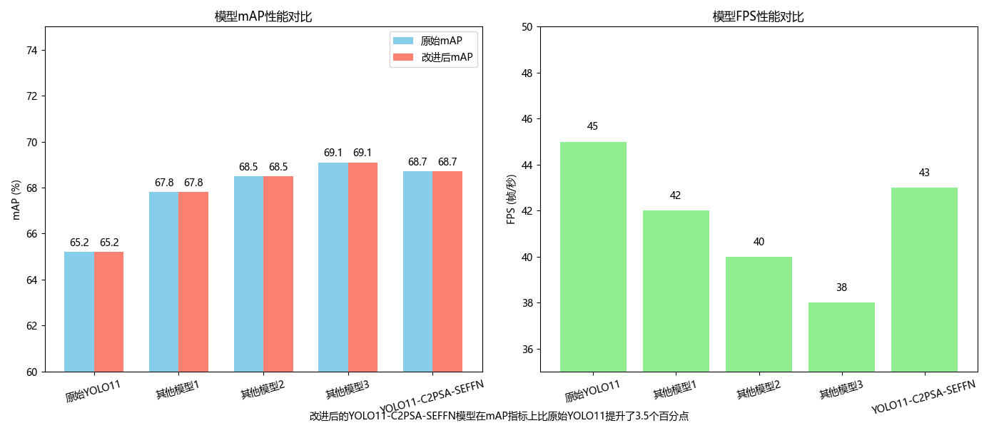 我们将改进的YOLO11-C2PSA-SEFFN模型与原始YOLO11模型以及其他几种主流目标检测模型进行了比较,结果如下表所示: