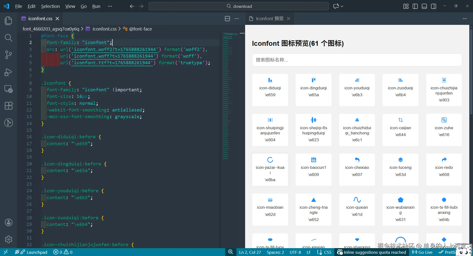 可视化缺失:CSS 文件中只有冰冷的类名和 Unicode 编码,无法直观预览图标样式