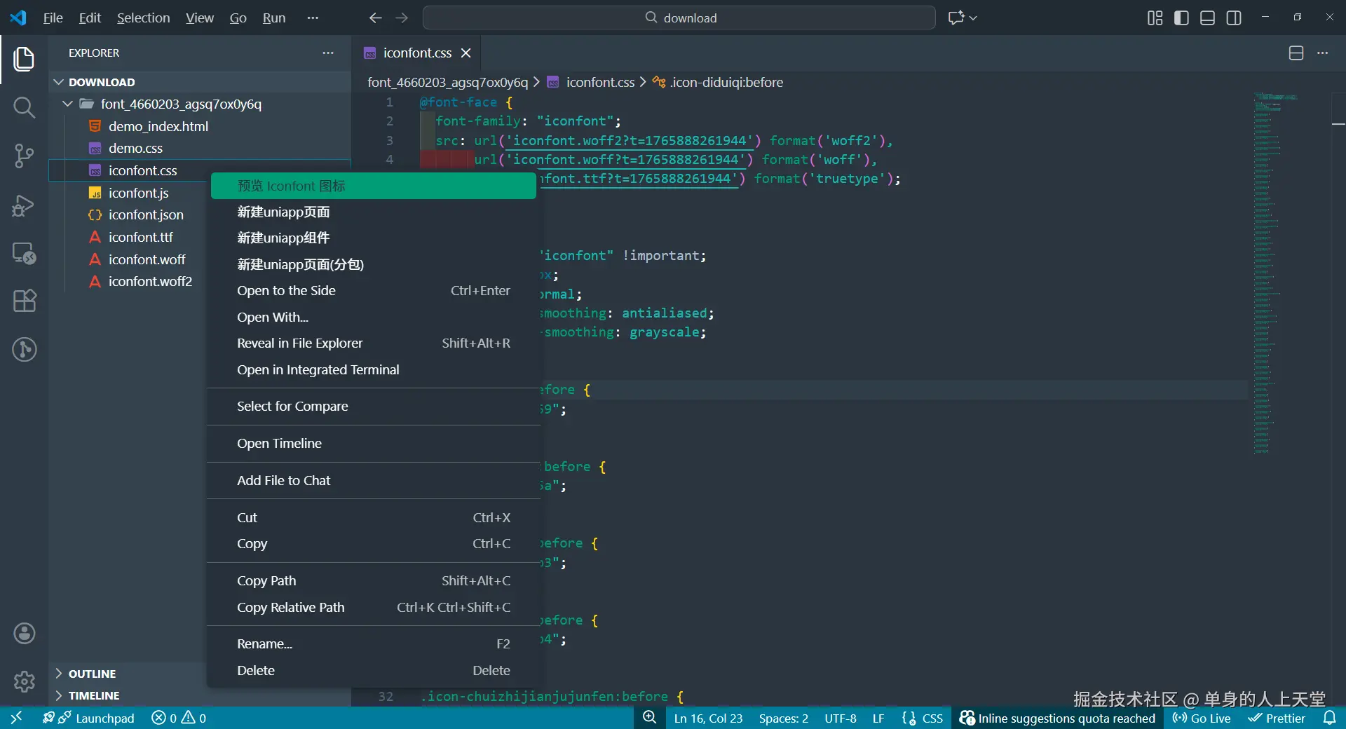 - 通过资源管理器:在项目中的 CSS 文件上右键,选择"预览 iconfont 图标"
