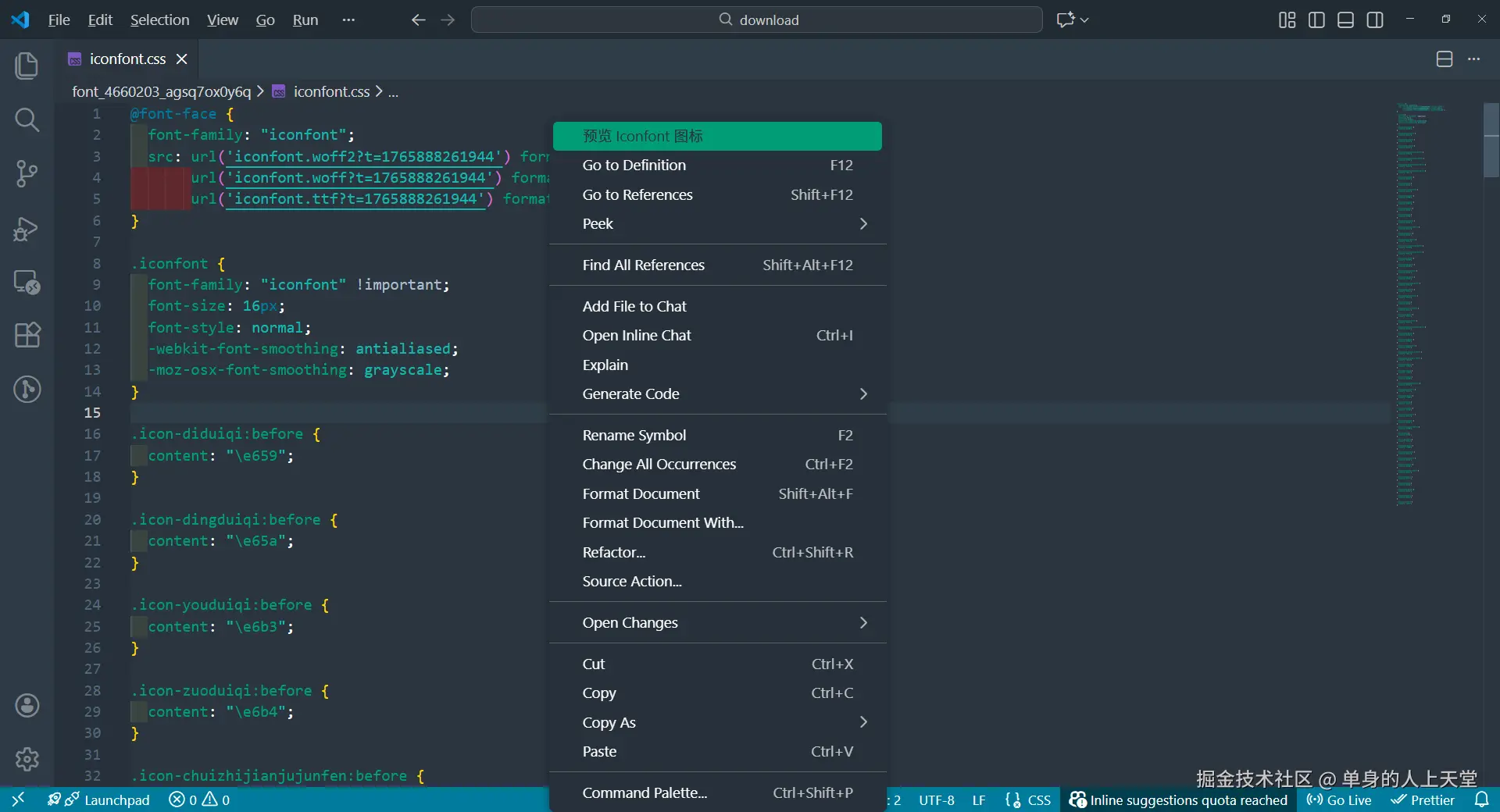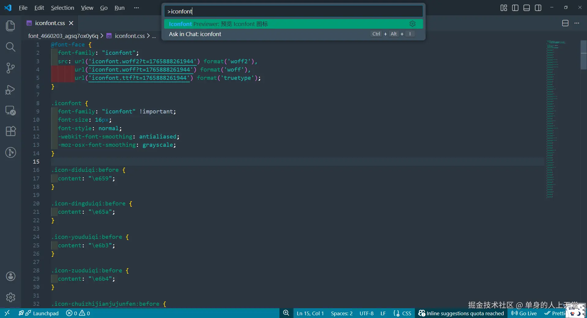 在日常前端开发中,Iconfont 几乎是不可或缺的图标资源库。然而,相信很多开发者都有这样的经历:在 CSS 文件中定义了几十个图标类,每个图标只有一个类名和一个 Unicode 编码,无法直观地看到每个图标长什么样。每次需要查找特定图标时,都不得不在 CSS 文件和浏览器预览页面之间反复切换,或者依赖可能已经过时的项目图标文档。 这种低效的操作方式不仅打断了开发流程,也影响了开发体验。正是这个看似不大却十分恼人的痛点,催生了我开发这款 VSCode 插件的想法。