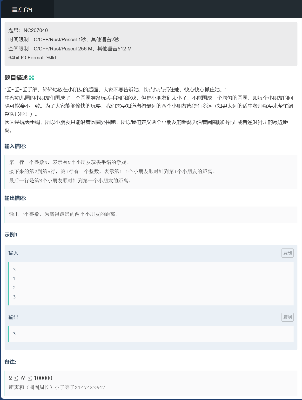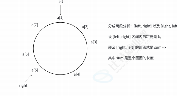 由于我们需要计算两个小朋友,即圆上两点的距离最大值。注意到如果固定left,right向右走,如果[left, right]之间的距离小于等于sum(圆周长)/2,这个是合法情况,找出这个距离的最大值即可。当[left, right]的距离大于sum/2时,我们向右移动left,直到[left, right]合法,更新结果。