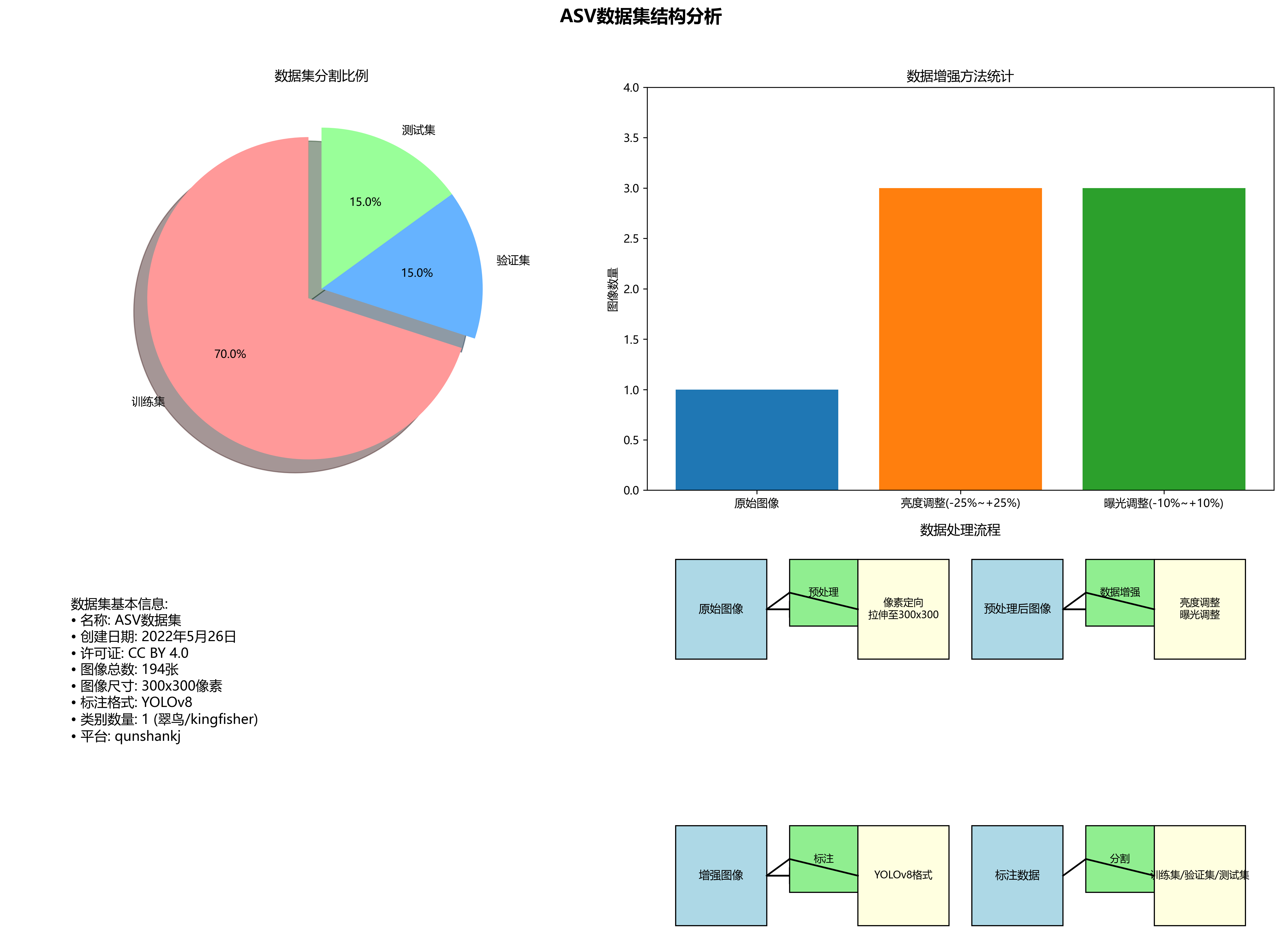 该数据集名为ASV,于2022年5月26日创建,采用CC BY 4.0许可证授权。数据集通过qunshankj平台导出,该平台为端到端计算机视觉平台,支持团队协作、图像收集与组织、非结构化图像数据理解与搜索、标注、数据集创建、模型训练与部署以及主动学习等功能。数据集包含194张图像,所有车辆(实际为翠鸟)均以YOLOv8格式进行标注。每张图像均经过预处理,包括像素数据自动定向(剥离EXIF方向信息)和拉伸至300x300像素大小。为增强数据集,对每张原始图像创建了三个版本,应用了随机亮度调整(-25%至+25%)和随机曝光调整(-10%至+10%)等变换,并对每张图像的边界框进行了相应变换。数据集分为训练集、验证集和测试集三个部分,包含一个类别:翠鸟(kingfisher)。该数据集适用于计算机视觉目标检测任务,特别是针对翠鸟这一特定物种的检测与识别研究。