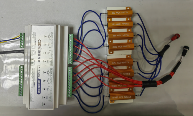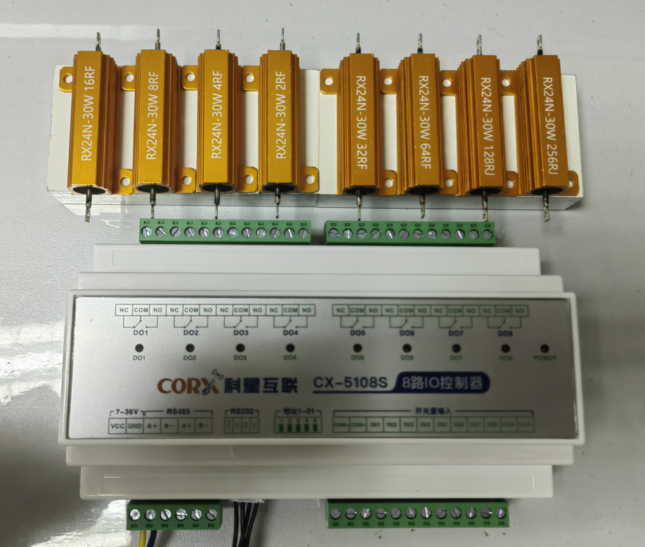 在阻值与 RTU 继电器模块的分配策略上,采用的设计是:继电器的 IO 号与上述电阻梯度分配公式 2^n 中的 n 相等,即 IO1 对应的阻值为 n=1,也就是 2Ω,其余依次类推。此外,所有电阻的另一端均统一连接至继电器的公共端。通过这样的连接方式,既能实现单路选定固定阻值电阻,又能通过多路并联实现阻值的插补。虽然在当前项目中并不需要这种插补功能,但考虑到未来在其他方面的潜在应用需求,此处将其作为冗余设计予以保留。