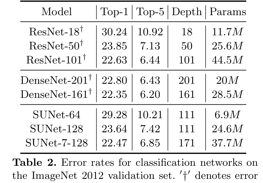 与 ResNet [25] 和 DenseNet [27] 一样,SUNet 中的大部分处理工作是在 14×14 的特征尺度上进行的(共 46 个卷积层)以及 7×7 的特征尺度上(共 44 个卷积层)。然而,局部信息处理的顺序可能会导致在将这些流行的架构扩展到对象定位、检测和图像分割任务时,ResNet 和 SUNet 的性能存在显著差距。所有这些任务都需要像素级别的定位,因此需要一个能够高效整合局部和全局线索的深度架构。SUNet 的开发是实现这一目标的第一步。直观地说,多个 u-网络堆栈可以被视为 CRF [11] 中消息传递操作的多次迭代。