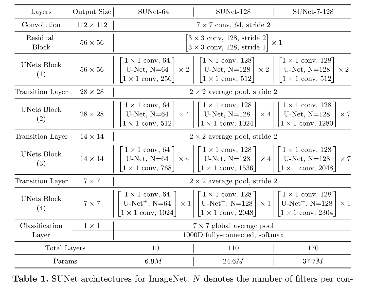 SUNets 在梯度流向最底层的 u-net 层时训练效果最佳。为避免梯度消失,我们在每个 u-net 模块周围都加入了跳跃连接[25,27]。此外,受瓶颈块设计的启发[25],我们还加入了 1×1 卷积层。瓶颈层将输入特征的数量限制在一个较小的数值(N)内,从而避免参数的过度膨胀。