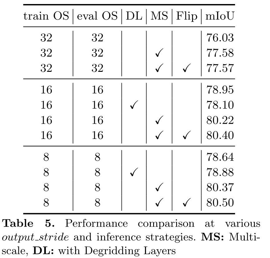 在不同输出步长和推理策略下的性能对比。MS:多尺度,DL:带有去网格化层