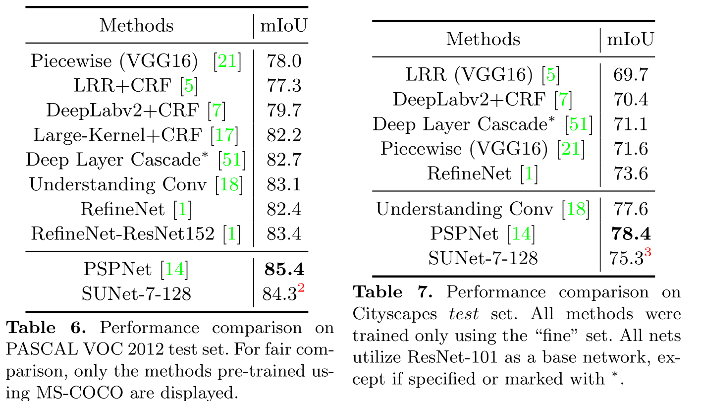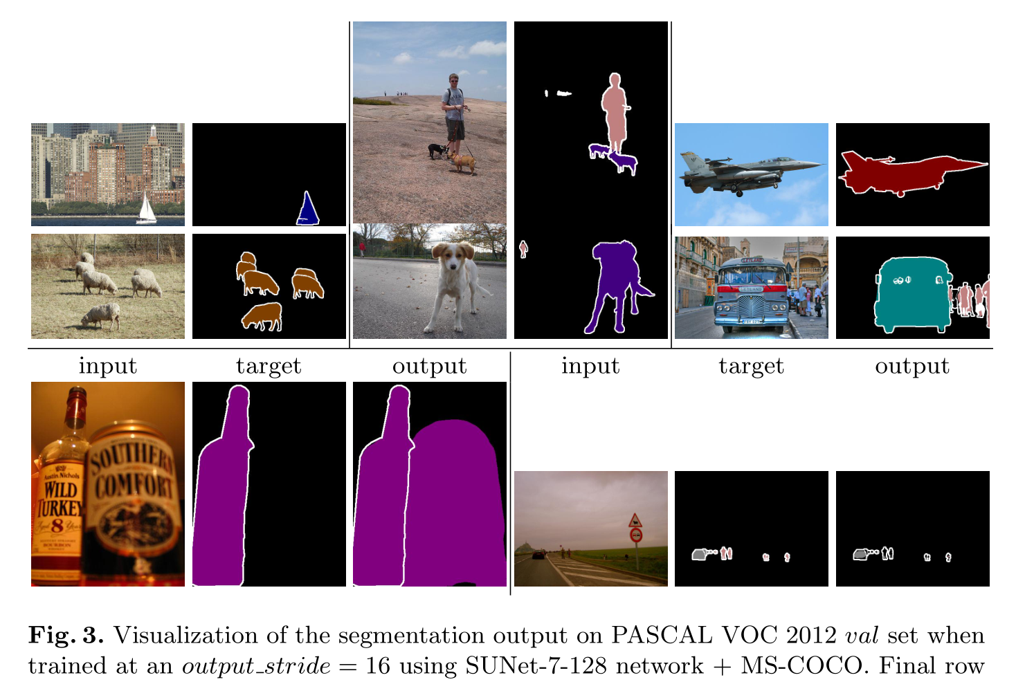 SUNet 不需要任何额外的事后结构调整,这类调整是近期一些研究(如解码层[1,3]、附加上下文聚合模块[15,14,13,7]以及学习条件随机场[11,10])所普及的。因此,我们将 SUNet 视为一个"基础款"网络。