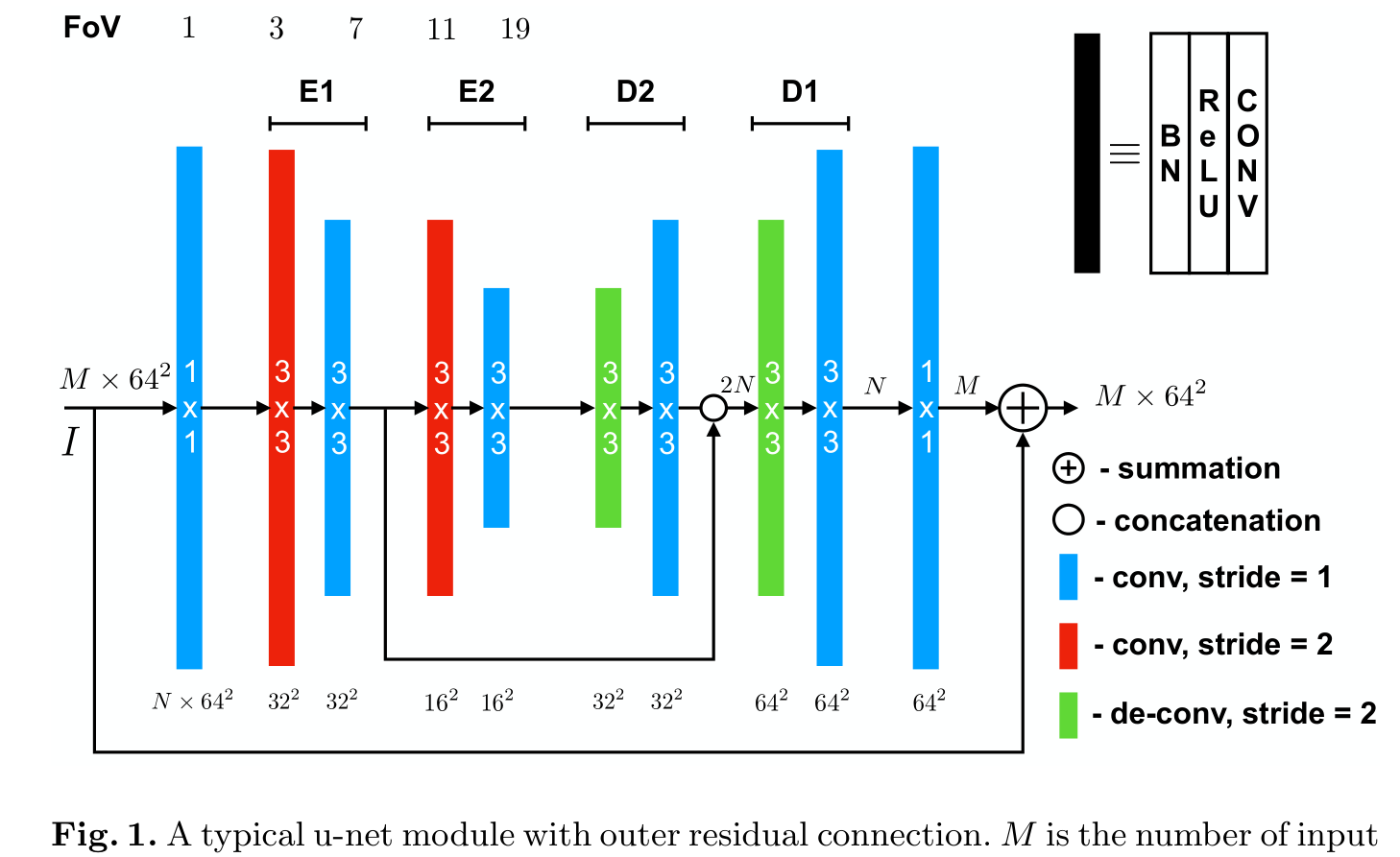 M 为输入特征的数量。在 U-网络模块中,每一层的输出特征图数量相同(除了最后的 1×1 滤波器),我们将其表示为N。为了更好地理解,该图还包含了每个卷积核的视场(FoV)(顶部)以及每个滤波器输出的特征图大小(底部),假设输入为 64×64 的 I。以彩色形式查看效果最佳。
