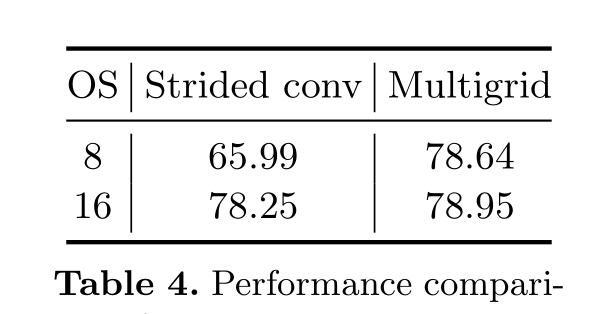 在每个 U-Net 模块内,将多重网格扩张与步进卷积进行性能对比,所使用模型为 SUNet-7-128,并以平均 IoU 进行评估。OS表示训练期间的输出步长。