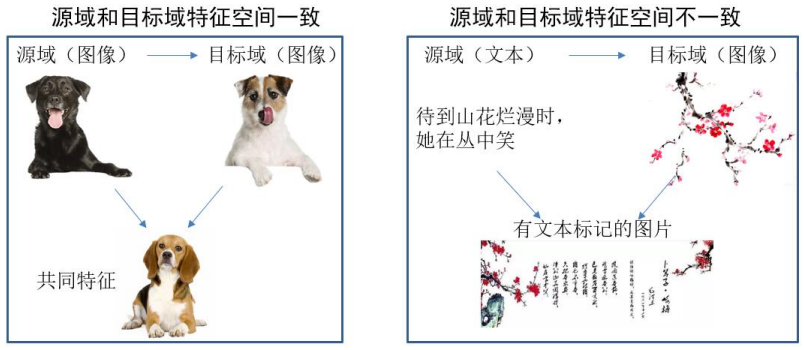 基于特征的迁移方法 (Feature based Transfer Learning) 是指将通过特征变换的方式互相迁移 [Liu et al., 2011, Zheng et al., 2008, Hu and Yang, 2011],来减少源域和目标域之间的差距;或者将源域和目标域的数据特征变换到统一特征空间中 [Pan et al., 2011, Long et al., 2014b, Duan et al., 2012],然后利用传统的机器学习方法进行分类识别。根据特征的同构和异构性,又可以分为同构和异构迁移学习。图15很形象地表示了两种基于特征的迁移学习方法。