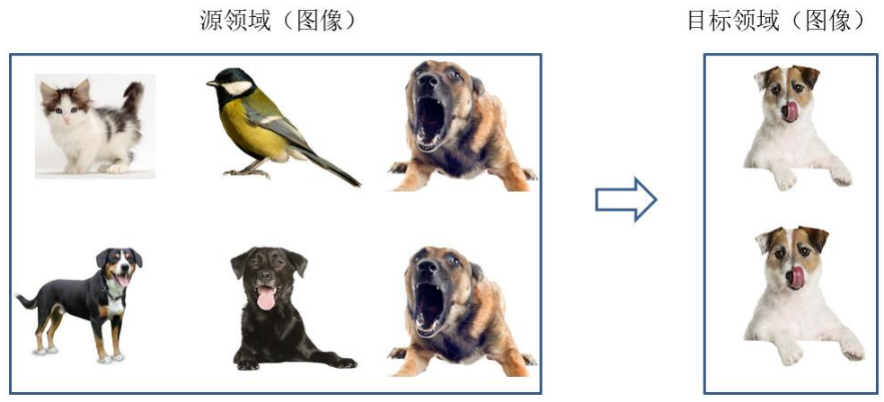 基于样本的迁移学习方法 (Instance based Transfer Learning) 根据一定的权重生成规则,对数据样本进行重用,来进行迁移学习。图14形象地表示了基于样本迁移方法的思想。 源域中存在不同种类的动物,如狗、鸟、猫等,目标域只有狗这一种类别。在迁移时,为了最大限度地和目标域相似,我们可以人为地提高源域中属于狗这个类别的样本权重。