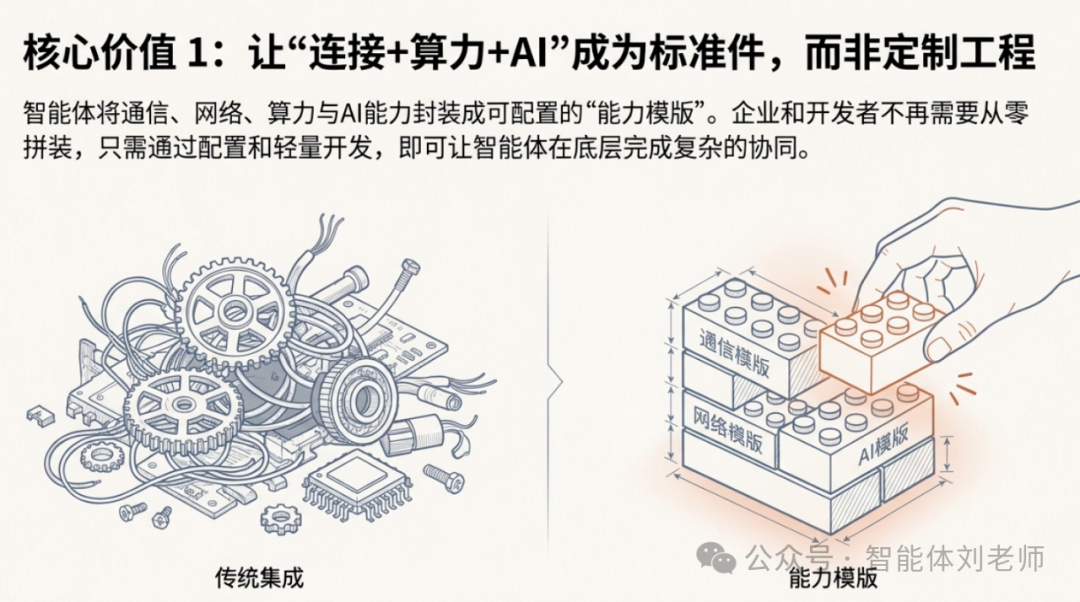 对企业和开发者来说,不再需要从零拼装通信+网络+云+AI,而是通过配置和轻量开发,让智能体在底层完成复杂的调用与协同,大幅降低集成门槛和试错成本。