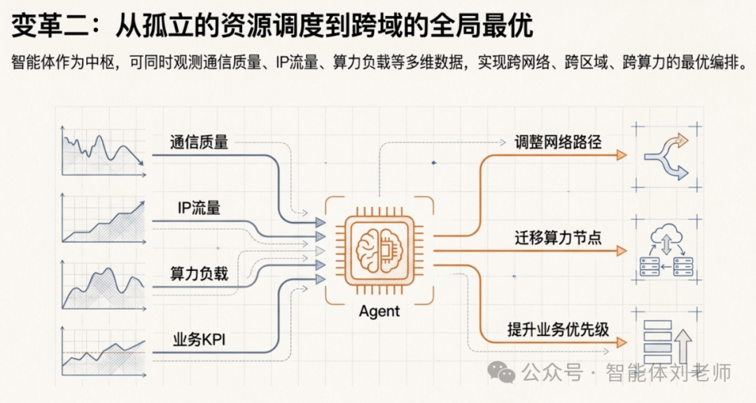 智能体作为中枢,可以同时观测通信质量、IP流量、算力负载、业务KPI等多维数据,通过策略或大模型自动决策:哪些业务优先、在哪里算、走哪条路、用什么方式告警,从而实现跨网络、跨区域、跨算力的全局最优编排。