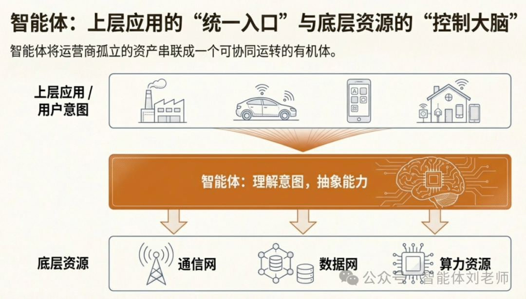 一旦有了智能体这层实体,通信网、数据网和算力资源就不再是彼此孤立的资产,而是被智能体"串成了一个可协同运转的机体"。