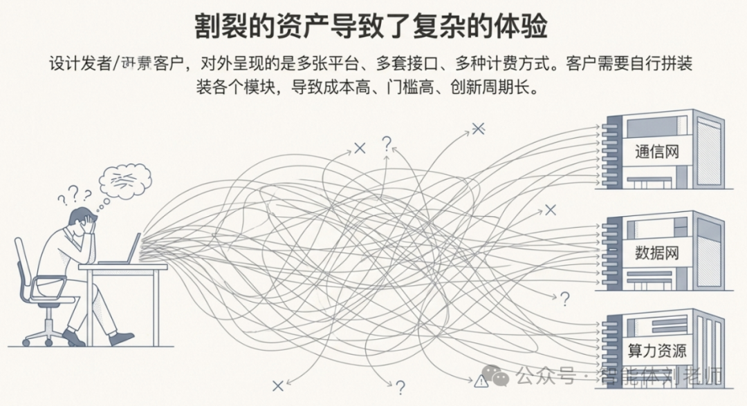 这导致对外呈现的是多张平台、多套接口、多种计费方式,客户要想做一件稍微复杂点的事,就需要自己去对接通信、网络、云和AI的各个模块,成本高、门槛高、创新周期长。