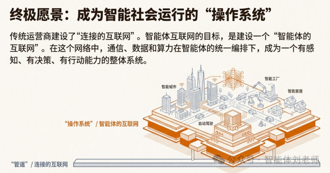 如果说传统运营商建设的是"连接的互联网",那么智能体互联网要建设的,就是"智能体的互联网":