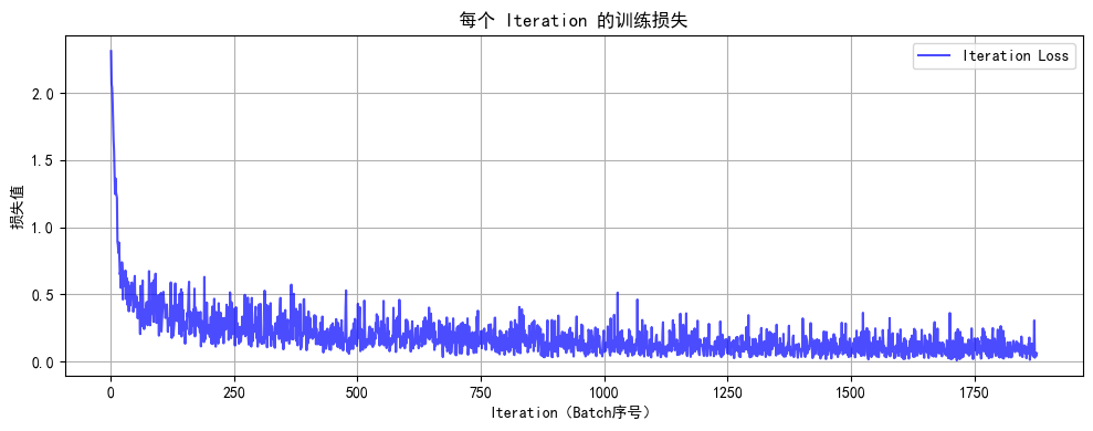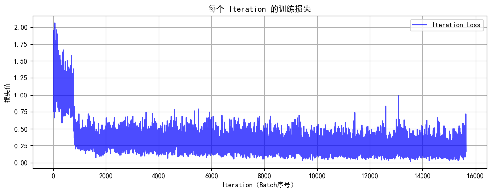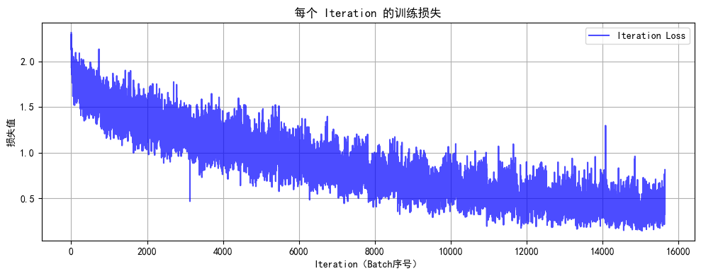 - 把每个 batch(iteration)的损失都存下来,最后画曲线,能直观看到 "每个批次训练后损失的变化"(比只看 epoch 平均损失更细)。