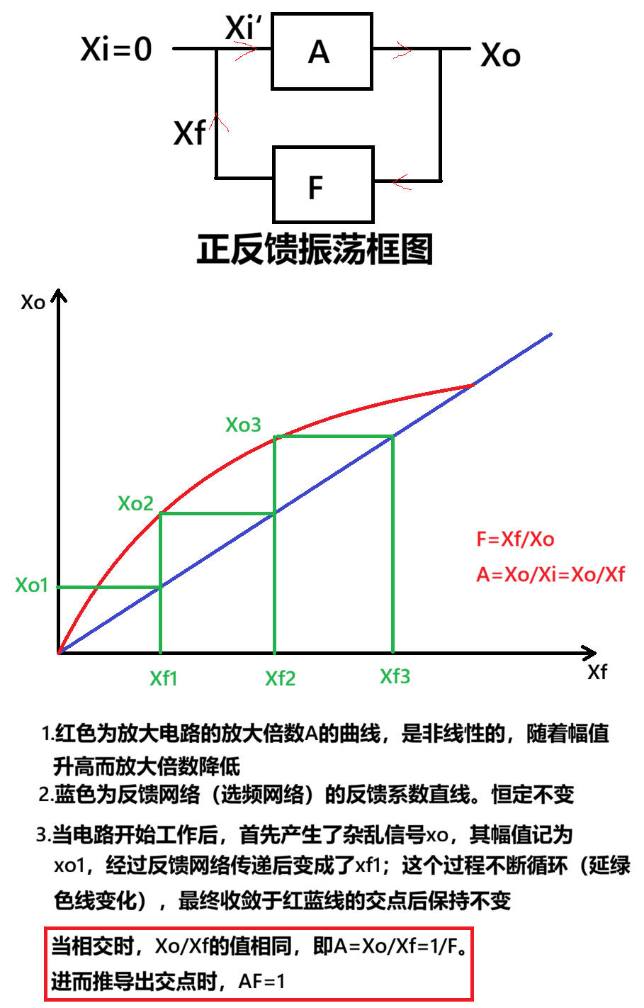- 起振时:放大倍数A足够大,让环路增益 |AF| > 1,信号从噪声开始逐渐放大;