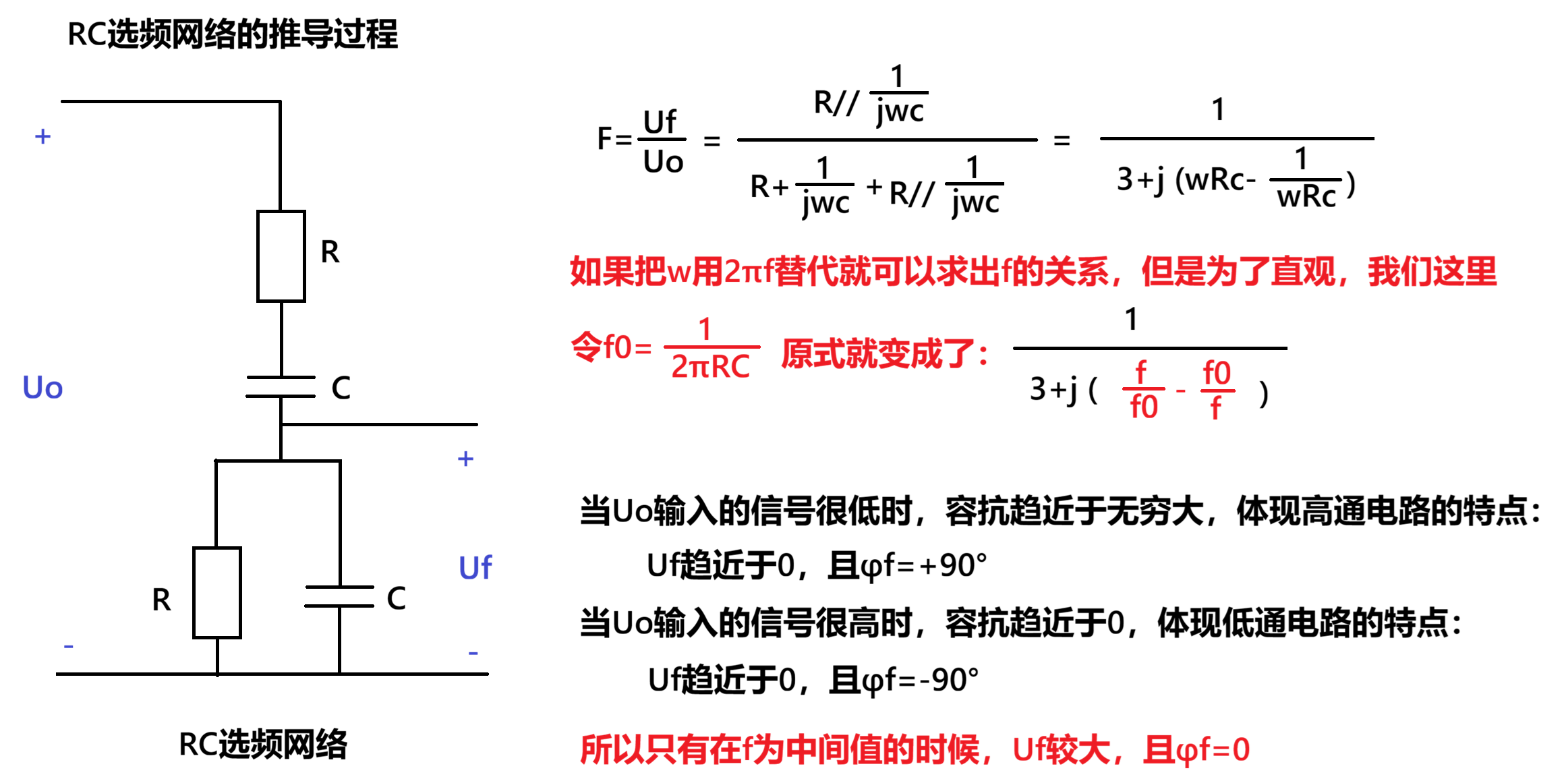 于是这样一个RC选频网络就能选出f0附近频率的信号,注意:这个选频比较温和,选出来的相近的信号,而非只有单独的一个频率。不过这种选频效率已经足够让整体体现正弦波的特点了,只不过可能不够精准,多用于对正弦波波形要求不是很高的场景中。