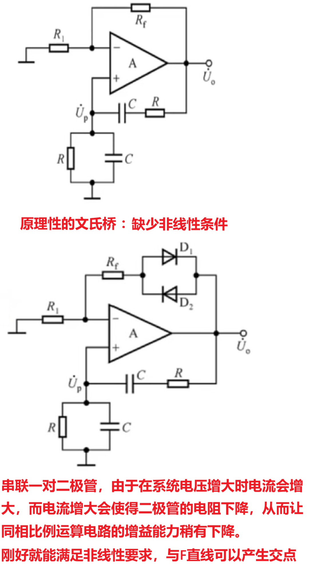 于是我们将采取集成运放这个组件来做正弦振荡器的放大器,不过由于他的同相比例运算电路的增益是线性的,无法与F的直线产生交点,所以我们会引入一个非线性原件,比如串联一个热敏电阻或者二极管。