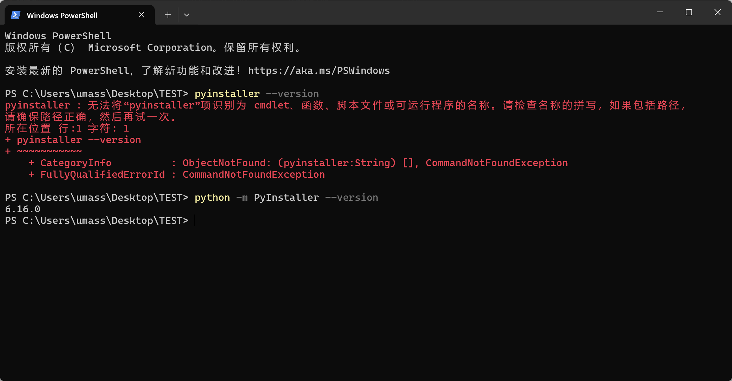 确认可以正常查询到PyInstaller模块的版本,表示PyInstaller模块是正常的