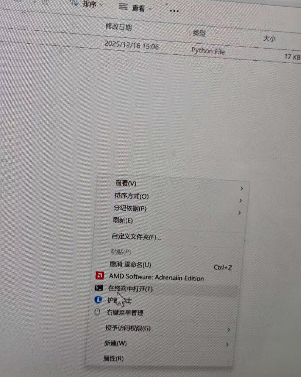 在这个xxx.py文件所在的文件夹里面,鼠标右键,注意不是选中文件右键,就是在文件夹空白处右键 ,点击在终端中打开(T),快捷键是鼠标右键后,按T
