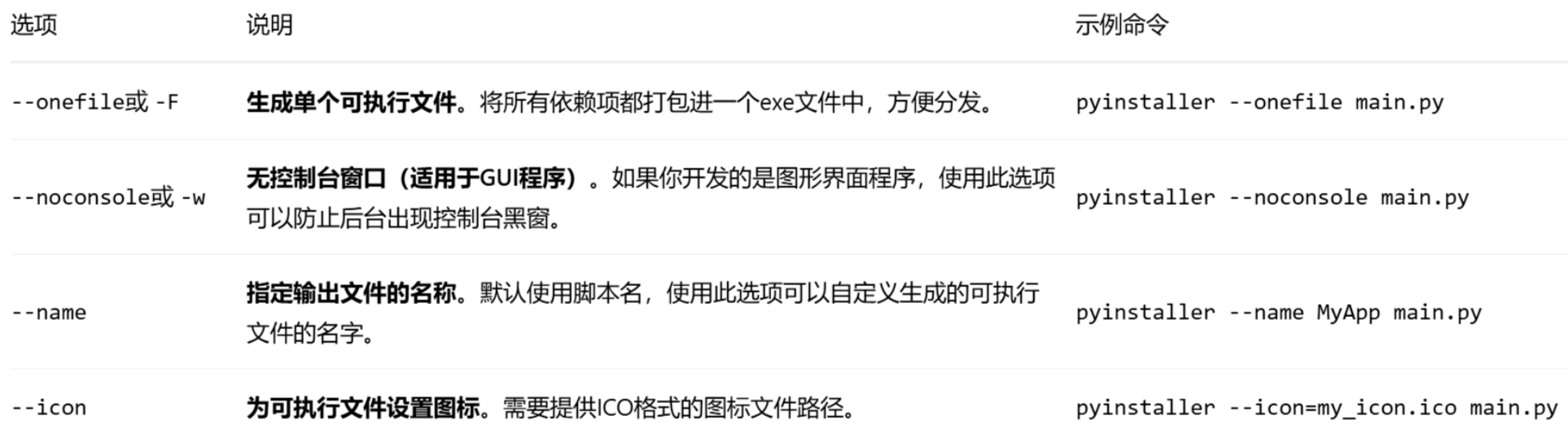 你可以根据需要组合这些选项。例如,要生成一个名为"MyApp"、没有控制台窗口的独立exe文件,可以这样写: