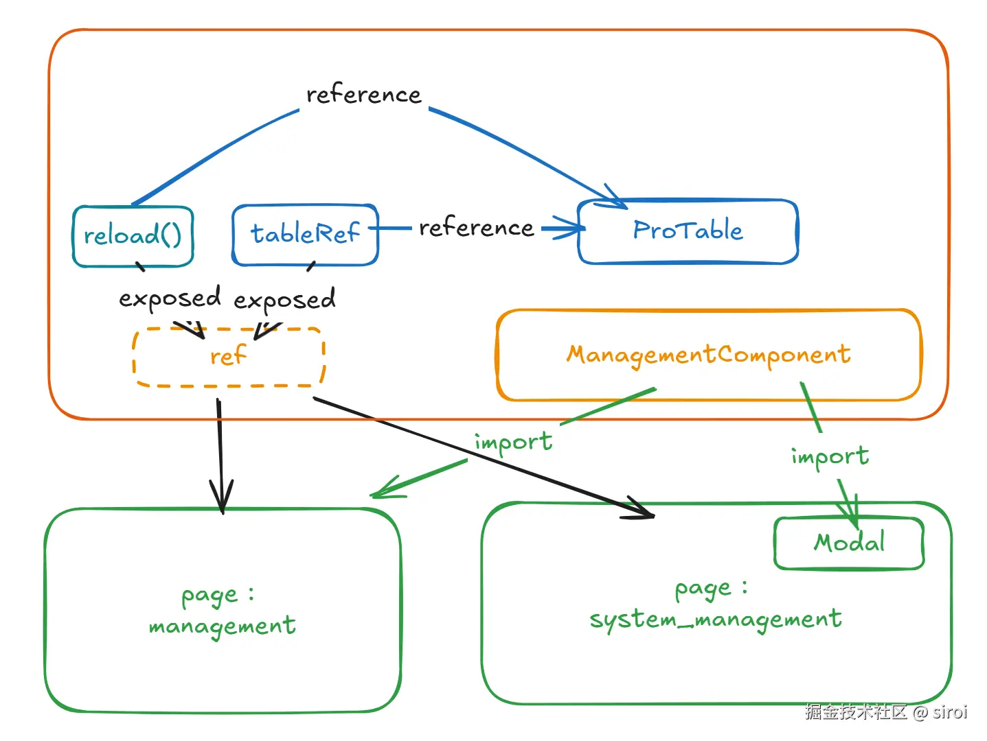ManagementCompnent封装了ProTable,通过 ref 对外暴露reloadTable等方法;- 被两个页面复用: