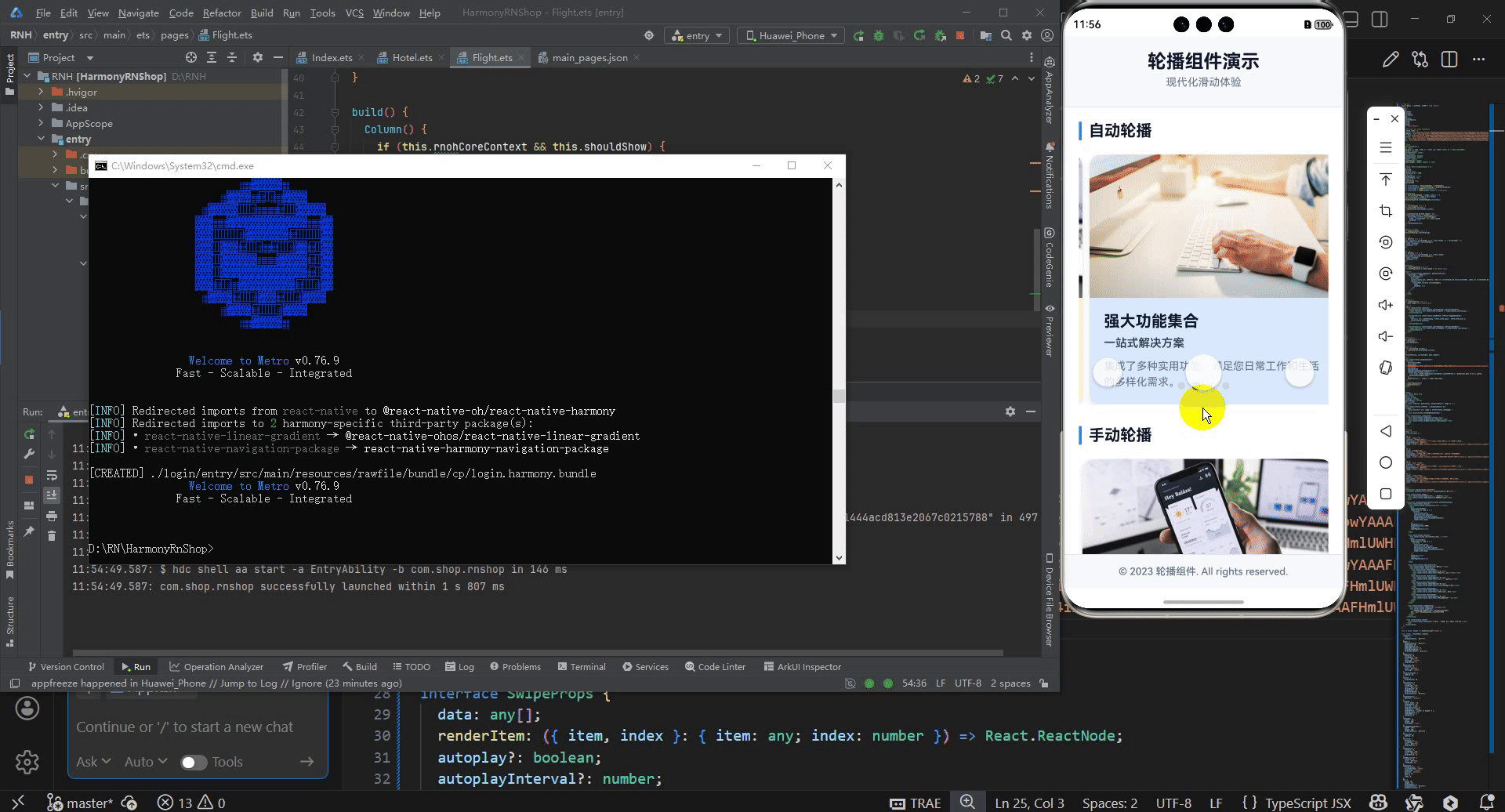 在鸿蒙系统适配方面,这套实现方案面临着深层次的技术架构差异。React Native的轮播依赖于FlatList的分页滚动和定时器系统,通过JavaScript层的状态管理来控制滚动行为。而鸿蒙的ArkUI框架提供了Swiper组件作为系统级的轮播实现,采用声明式配置方式,开发者只需设置轮播项和配置参数,系统会自动处理滚动动画和循环逻辑。鸿蒙的Swiper组件在底层直接调用系统的滚动和动画服务,避免了跨语言通信带来的性能损耗。