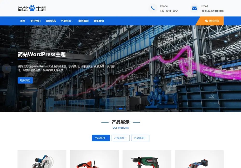 蓝色风格的轻工业wordpess企业主题,适合制造业工厂或做相关产品的外贸公司使用。