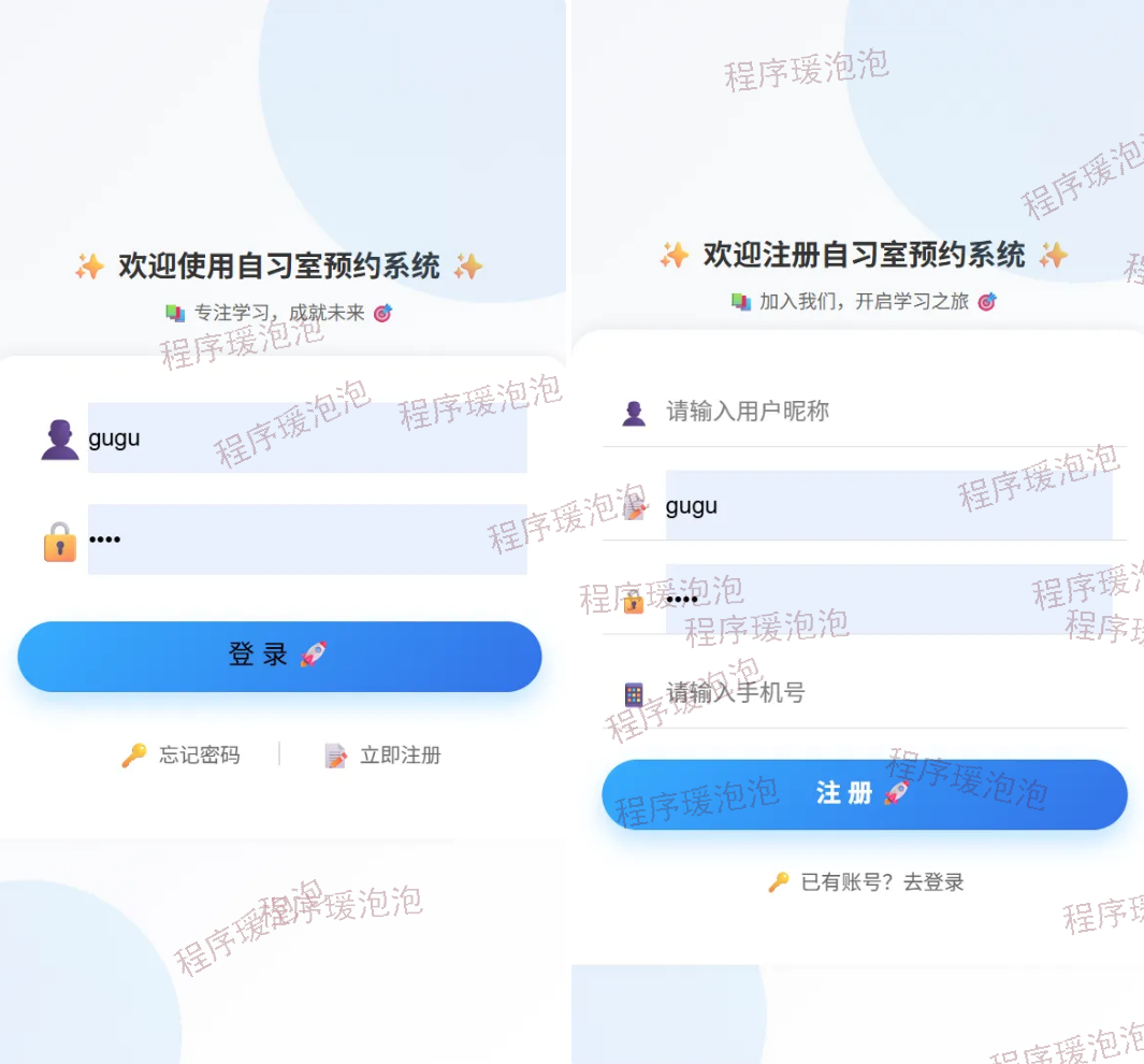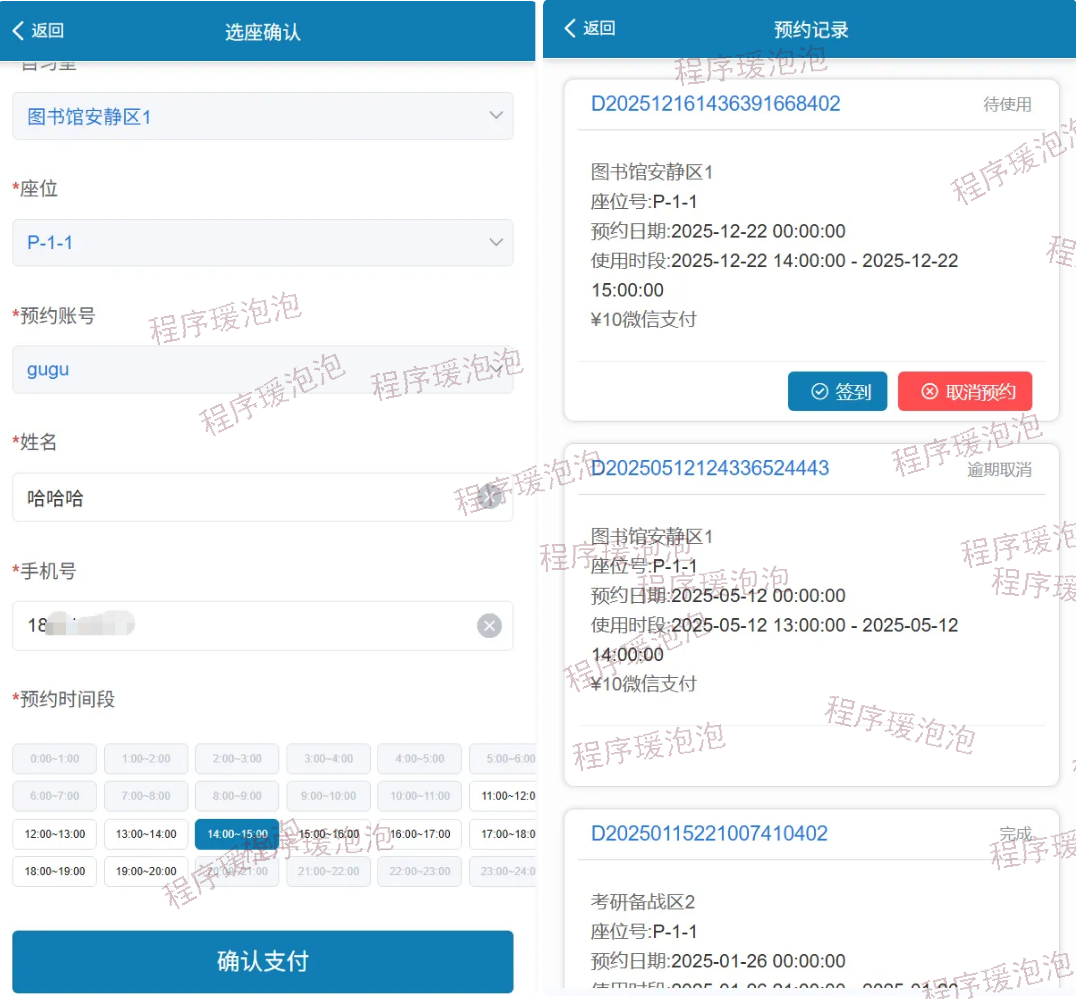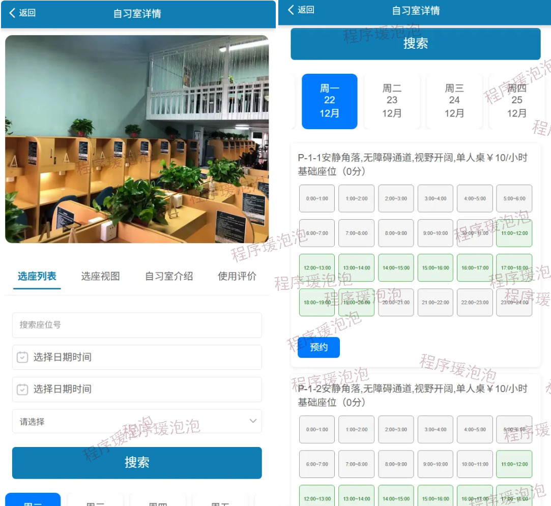 (5)进行预约自习室:用户选择好合适的自习室,可进行预约,可通过日期等进行搜索座位,选择好座位后,进行预约。