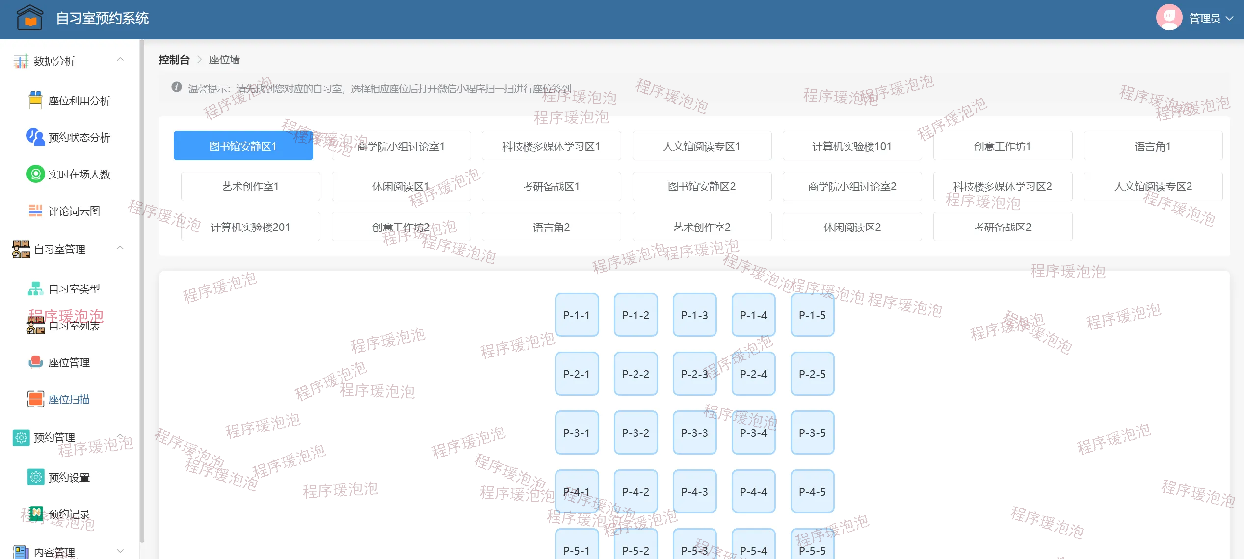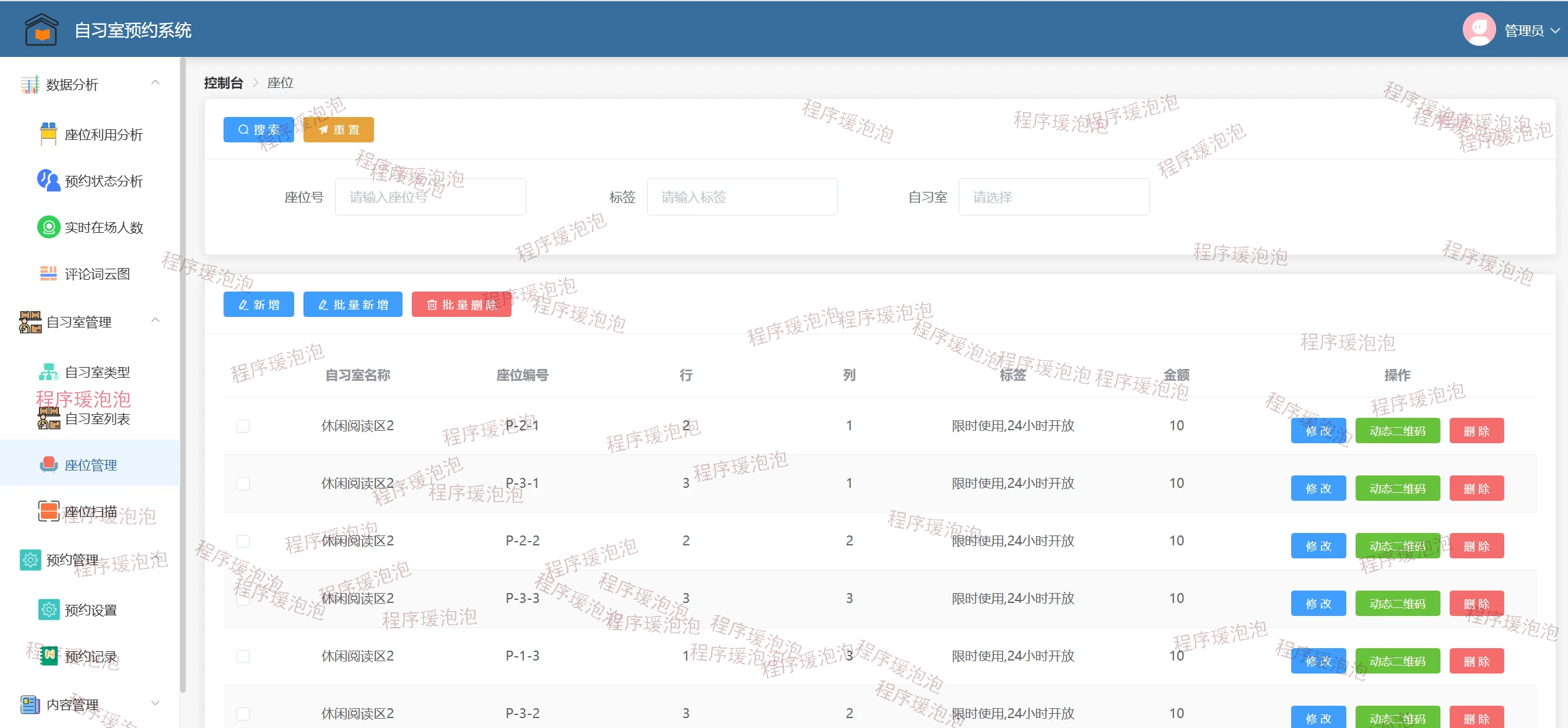 (4)维护座位信息:管理员可以为每一个自习室维护座位信息,支持进行批量添加座位,修改座位以及删除座位,可查看座位的动态二维码。