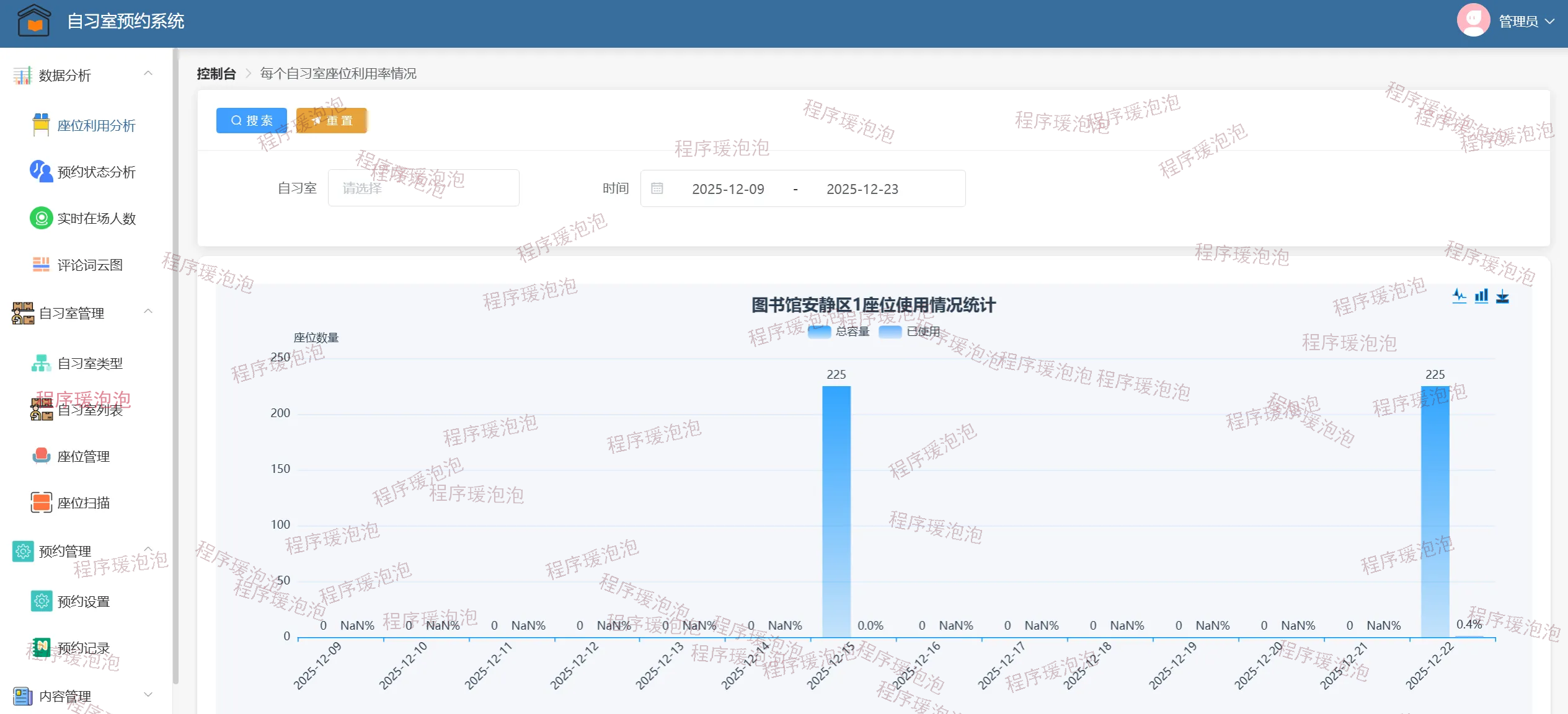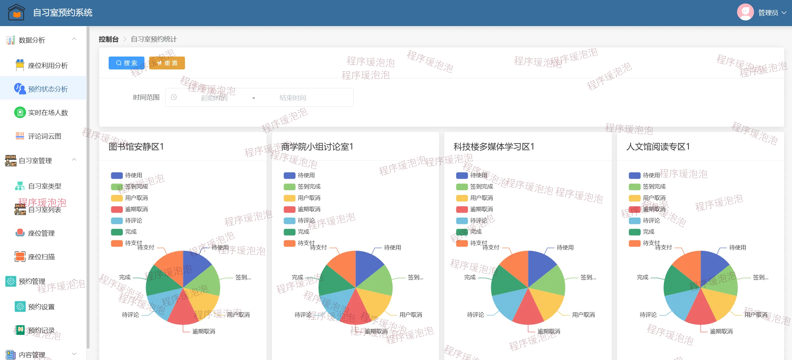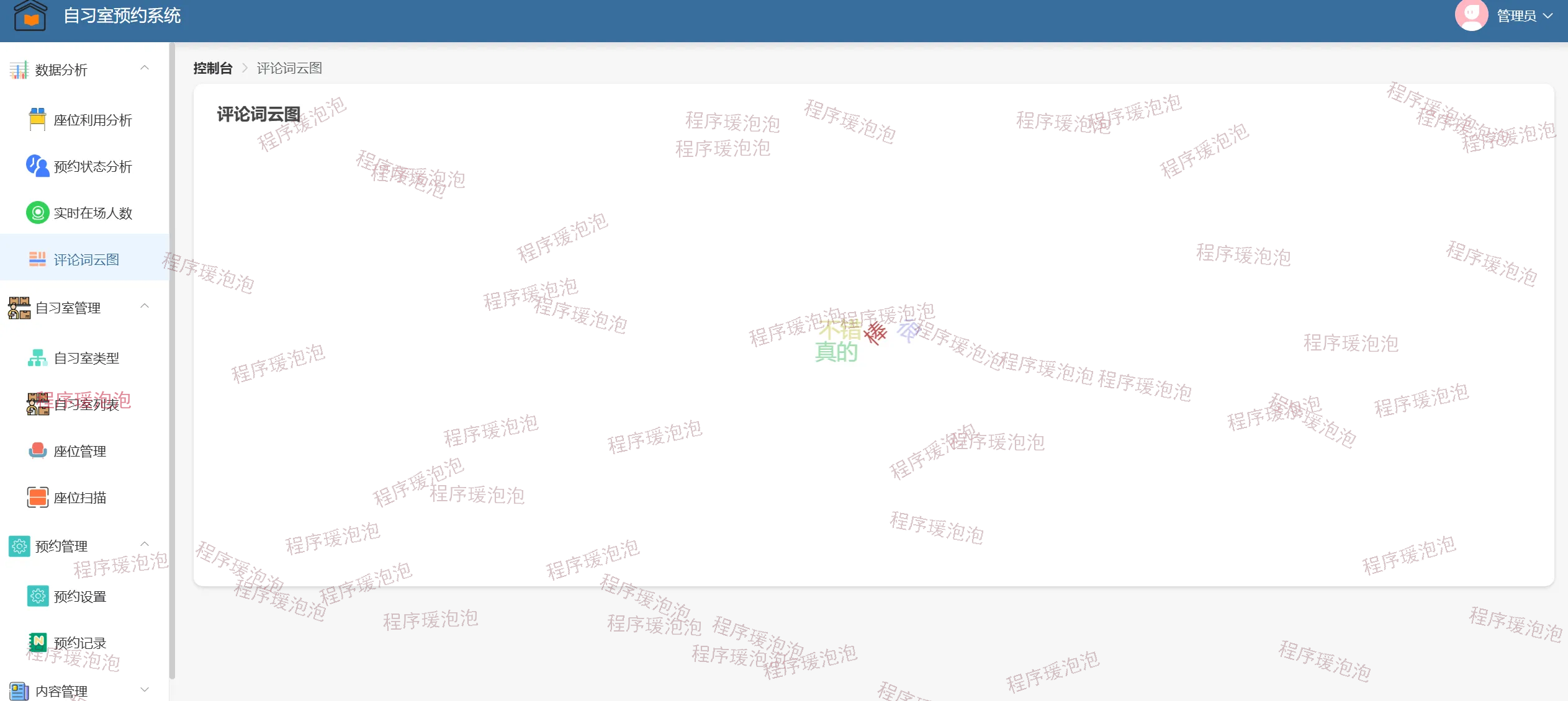 (1)查看数据分析:系统通过柱状图展示座位利用分析,饼图展示预约状态分析,评论词云图,折线图展示实时在场人数。