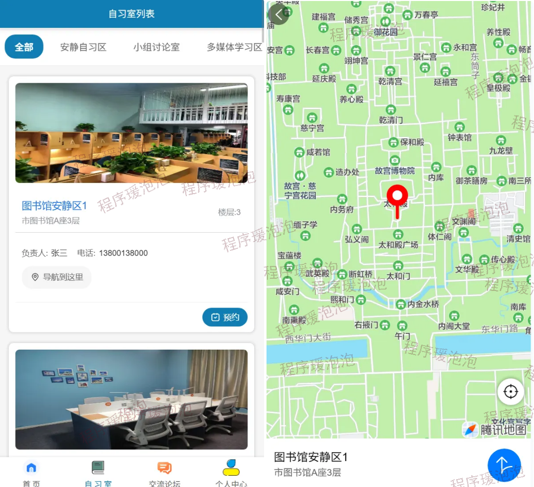 (6)腾讯地图导航:系统介入了腾讯地图API,用户可通过腾讯地图导航到自习室目的地。