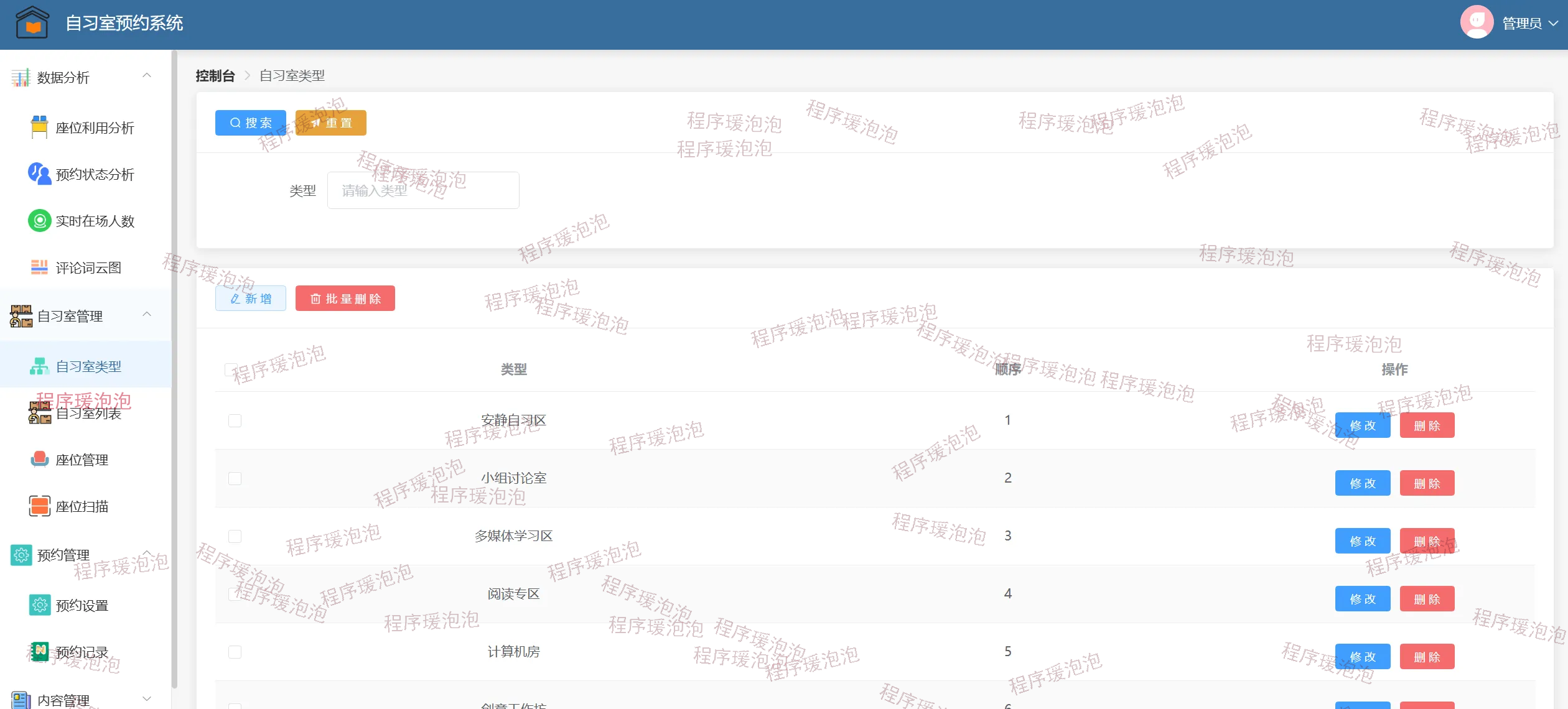 (2)维护自习室类型:管理员可以管理自习室的类型,进行增删改查自习室类型。