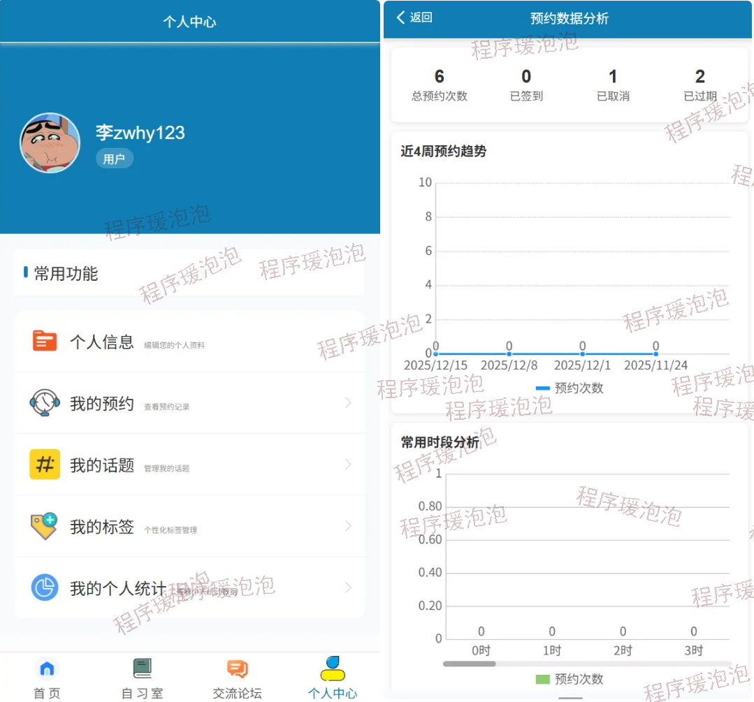 (8)查看个人中心:用户可以进行维护自己的个人信息,管理预约的自习室信息,管理个人发布的话题,设置用户标签,查看个人统计信息。