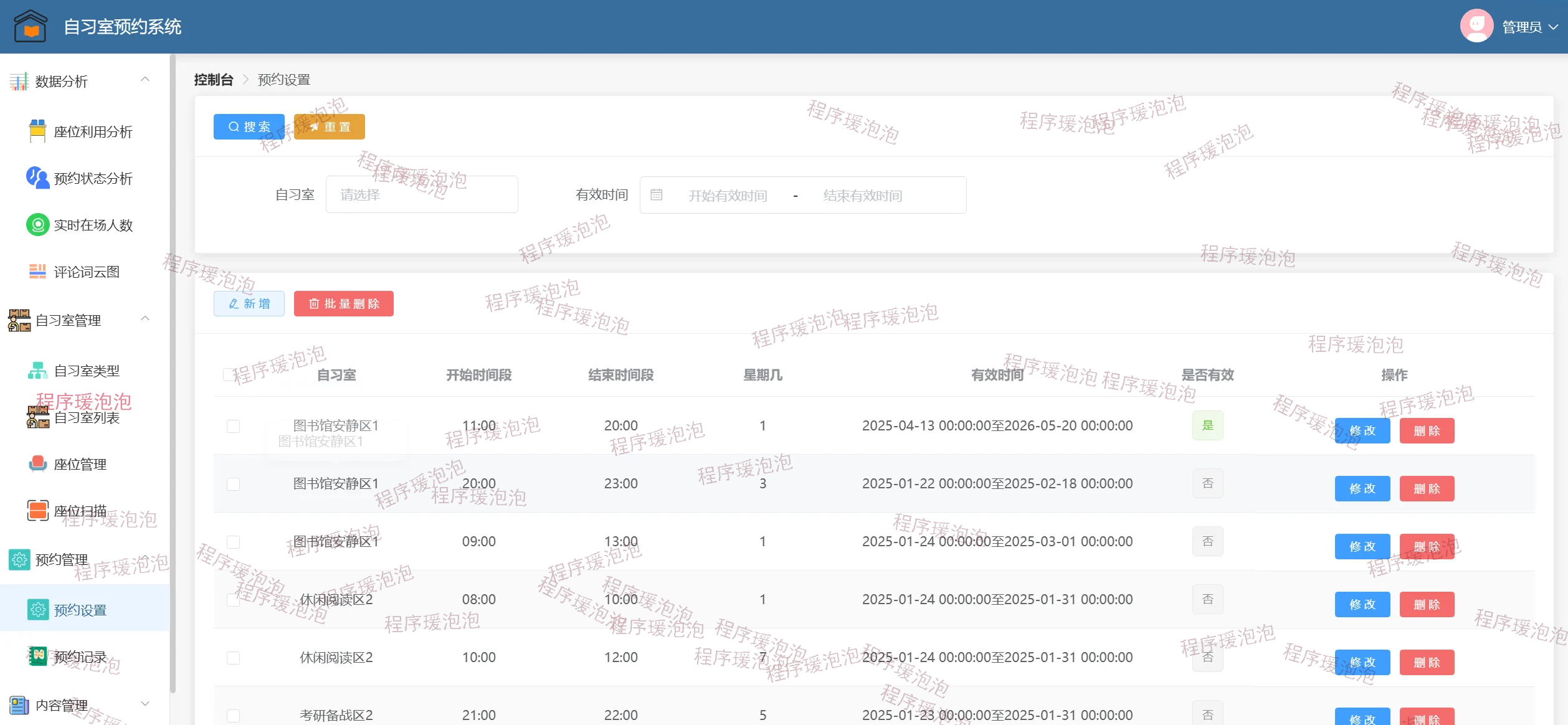 (6)设置预约配置:管理员可以维护自习室的预约配置信息。