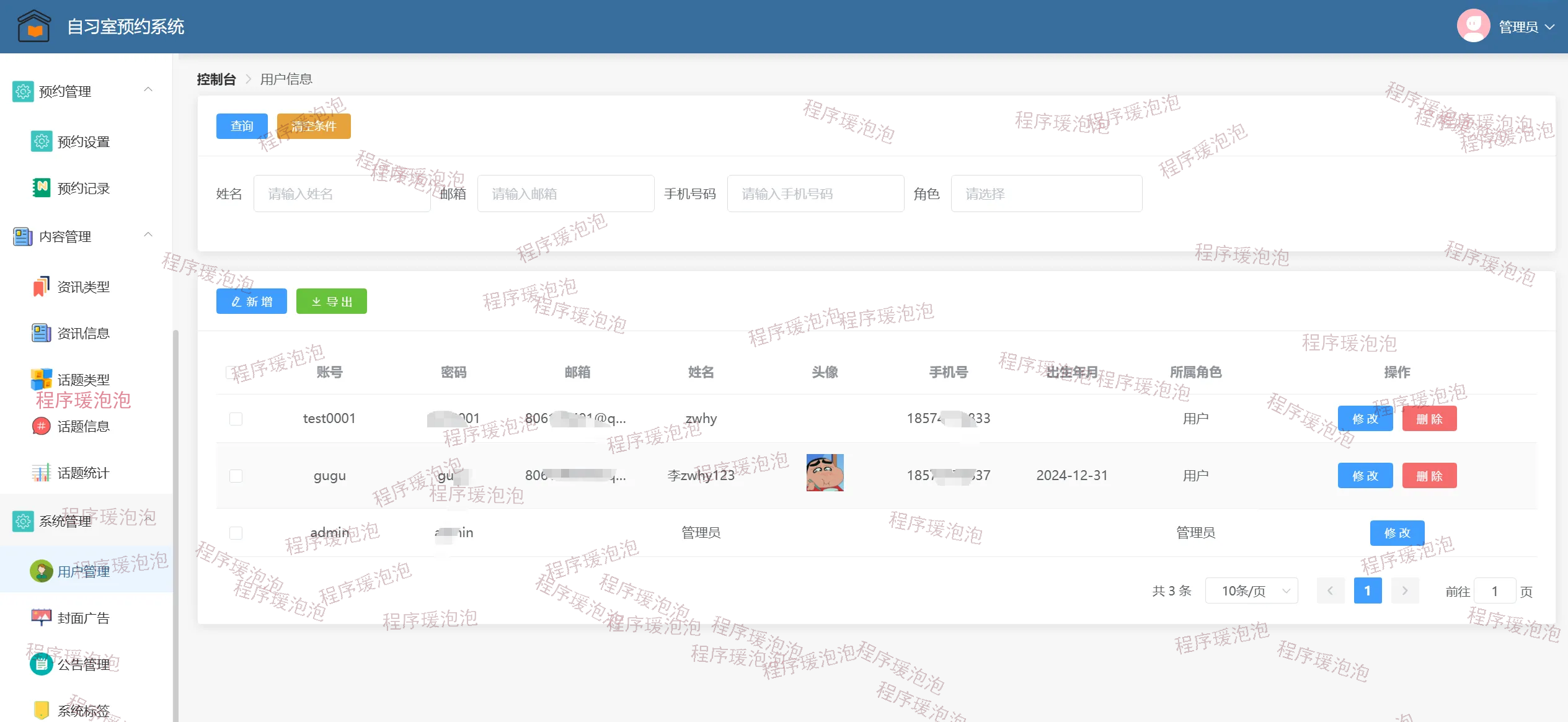 (12)管理用户信息:管理员管理用户信息,导出用户信息,进行增删改查操作。