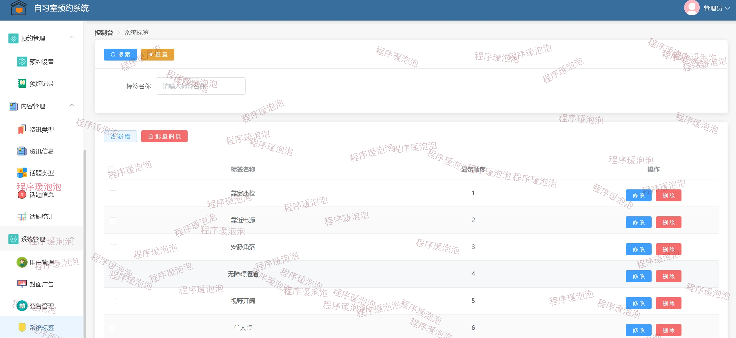 (15)管理系统标签:管理员进行管理系统的标签信息,可进行增删改查操作。
