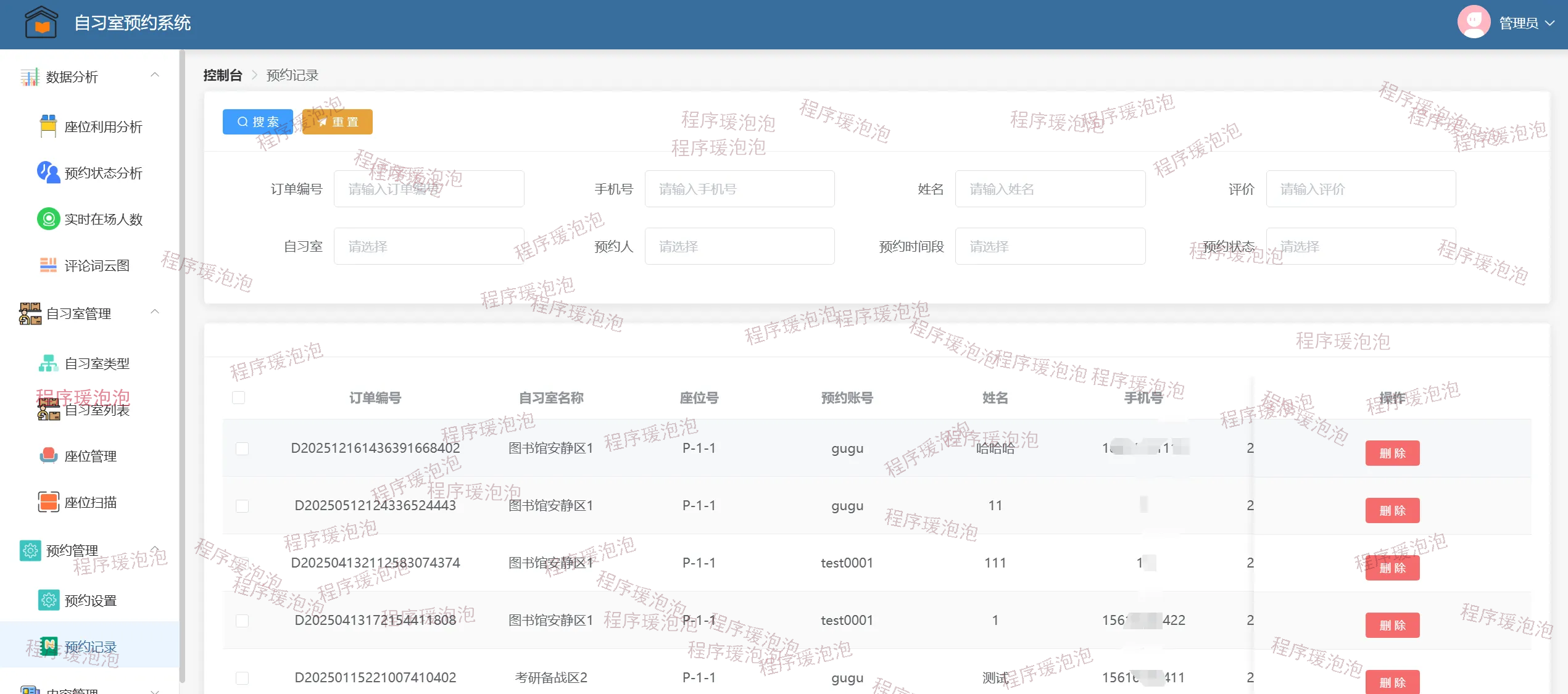 (7)查看预约记录:管理员可以通过特定条件查看预约记录,可以进行删除预约信息。