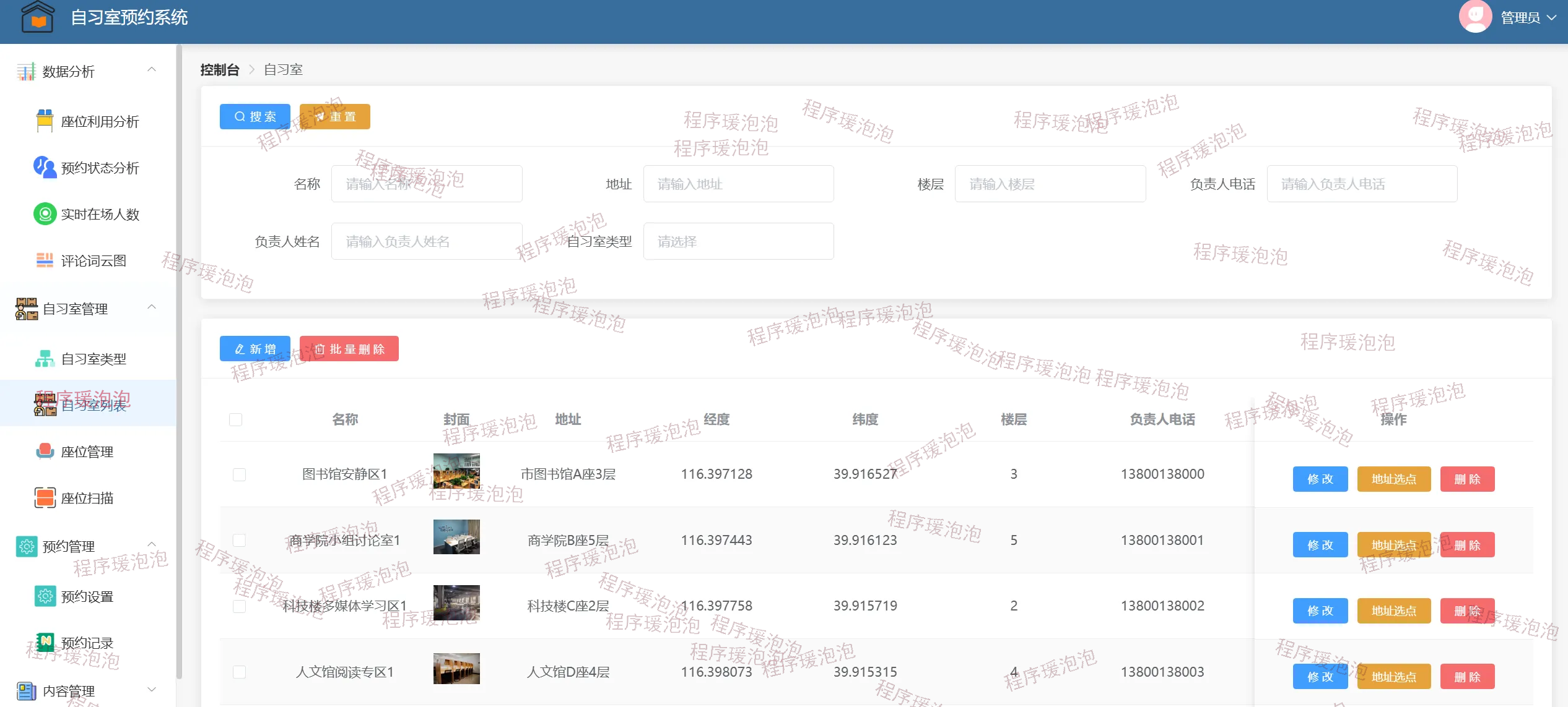 (3)管理自习室列表:管理员管理自习室列表信息,支持进行增删改查操作以及自习室位置选址。