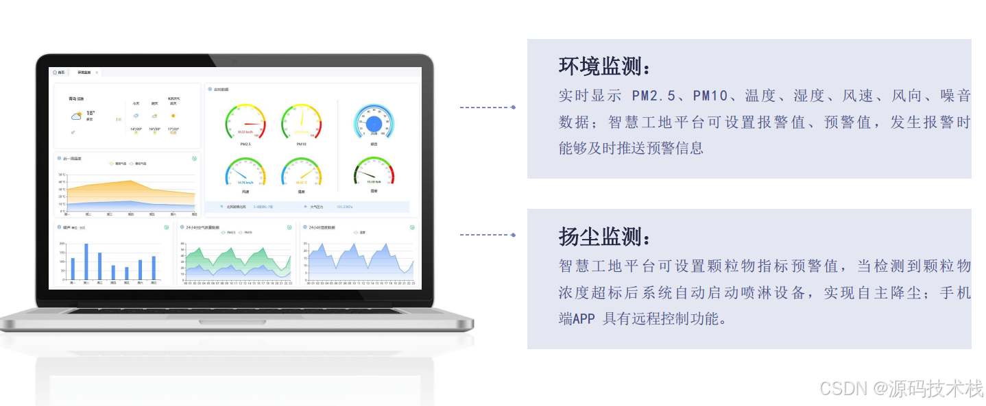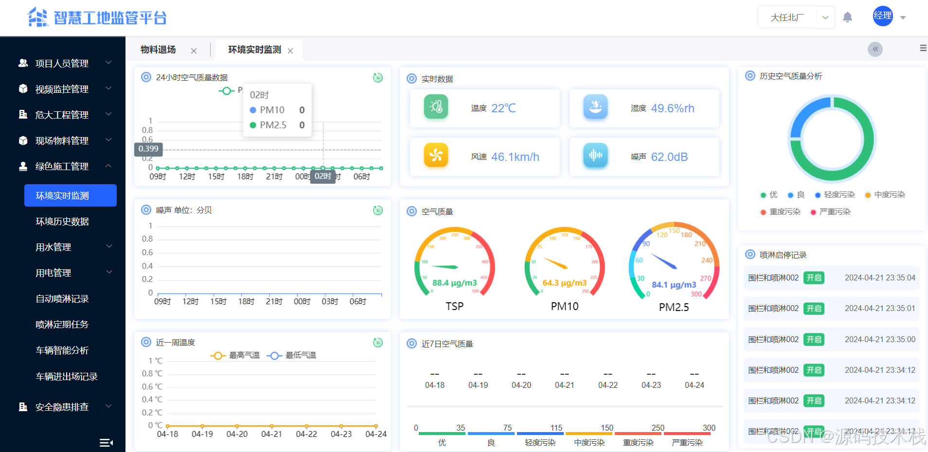 环境实时监测:对工地历史空气质量分析、喷淋启停记录、空气质量、温度、湿度、风速、噪声等实时数据监测。