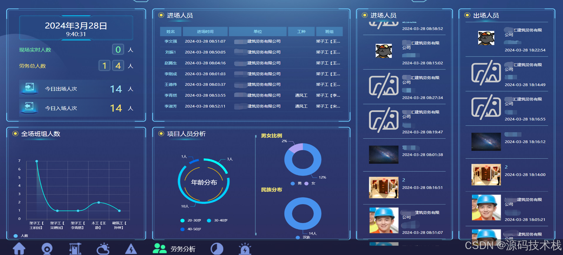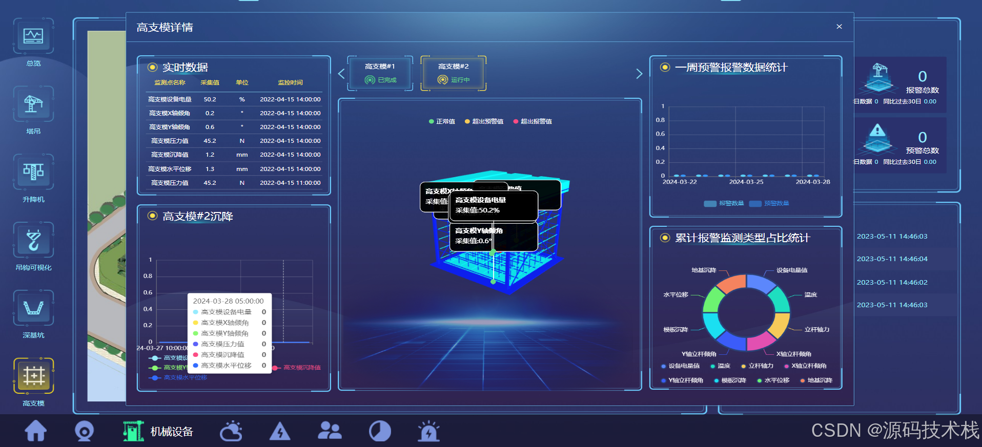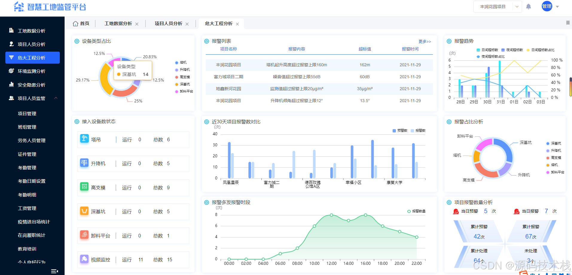 管理分析报表:采用统计报表、曲线图或柱状图等方式,按照年、月、天、小时等定制条件对实名制人员数据、大体积混凝土无线测温数据、噪声扬尘监测数据等业务运行情况进行汇总,生成统计报表,提供按照时间监测设备查询各类监测数据的明细情况。