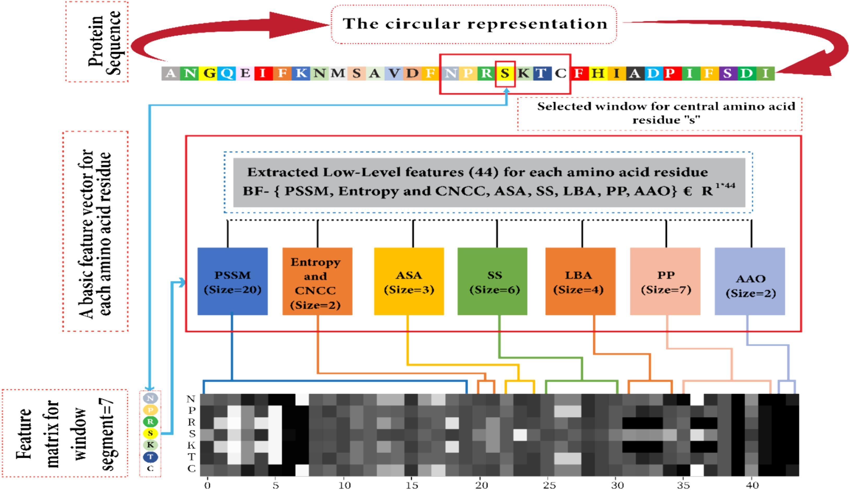 首先,需要把蛋白质序列这种文本信息,转换成计算机能理解的"情报档案"。他们为序列中的每个氨基酸(残基)收集了44个维度的信息,包括: