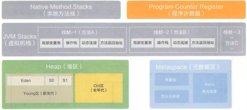 元数据区和堆 整个Java进程共用一份 程序计数器和栈 一个进程可能有很多份(每个线程有一份)