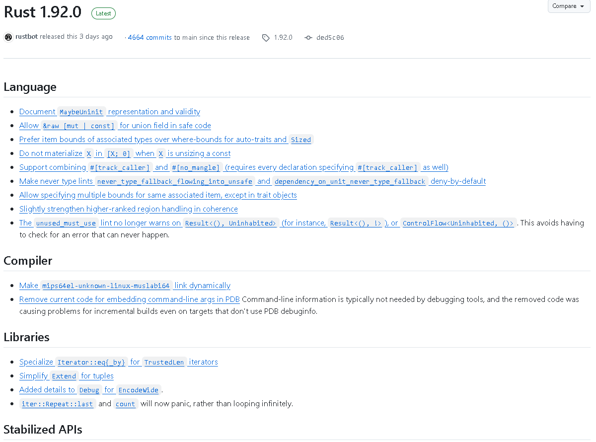 Rust 1.92.0 于 2025年12月11日预发布,并在 12月14日正式发布。本次版本更新在语言特性、编译器、标准库、Cargo、Rustdoc 等多个方面都有重要改进与优化。以下是详细内容。