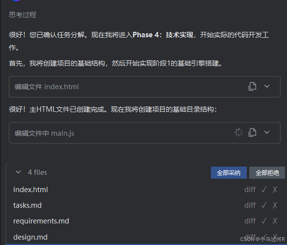 我们可以看到,确认任务分解之后它就开始执行技术代码实现了。